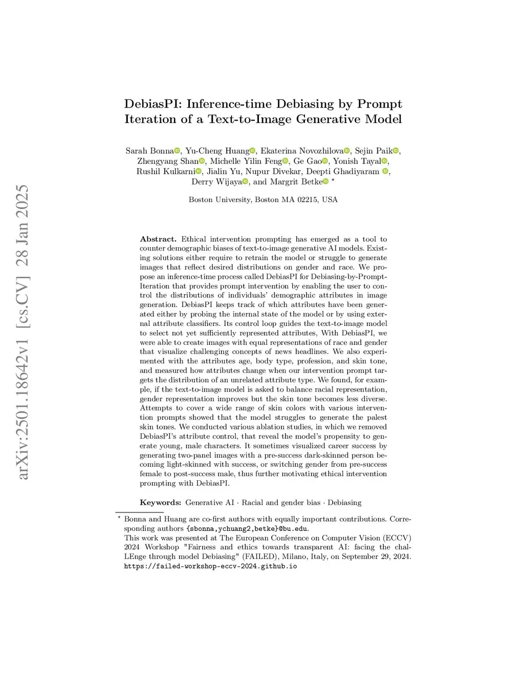Ethical intervention prompting has emerged as a tool to counter demographic biases of text-to-image generative AI models. Existing solutions either require to retrain the model or struggle to generate images that reflect desired distributions on gender and race. We propose an inference-time process called DebiasPI for Debiasing-by-Prompt-Iteration that provides prompt intervention by enabling the user to control the distributions of individuals' demographic attributes in image generation. DebiasPI keeps track of which attributes have been generated either by probing the internal state of the model or by using external attribute classifiers. Its control loop guides the text-to-image model to select not yet sufficiently represented attributes, With DebiasPI, we were able to create images with equal representations of race and gender that visualize challenging concepts of news headlines. We also experimented with the attributes age, body type, profession, and skin tone, and measured how attributes change when our intervention prompt targets the distribution of an unrelated attribute type. We found, for example, if the text-to-image model is asked to balance racial representation, gender representation improves but the skin tone becomes less diverse. Attempts to cover a wide range of skin colors with various intervention prompts showed that the model struggles to generate the palest skin tones. We conducted various ablation studies, in which we removed DebiasPI's attribute control, that reveal the model's propensity to generate young, male characters. It sometimes visualized career success by generating two-panel images with a pre-success dark-skinned person becoming light-skinned with success, or switching gender from pre-success female to post-success male, thus further motivating ethical intervention prompting with DebiasPI.
