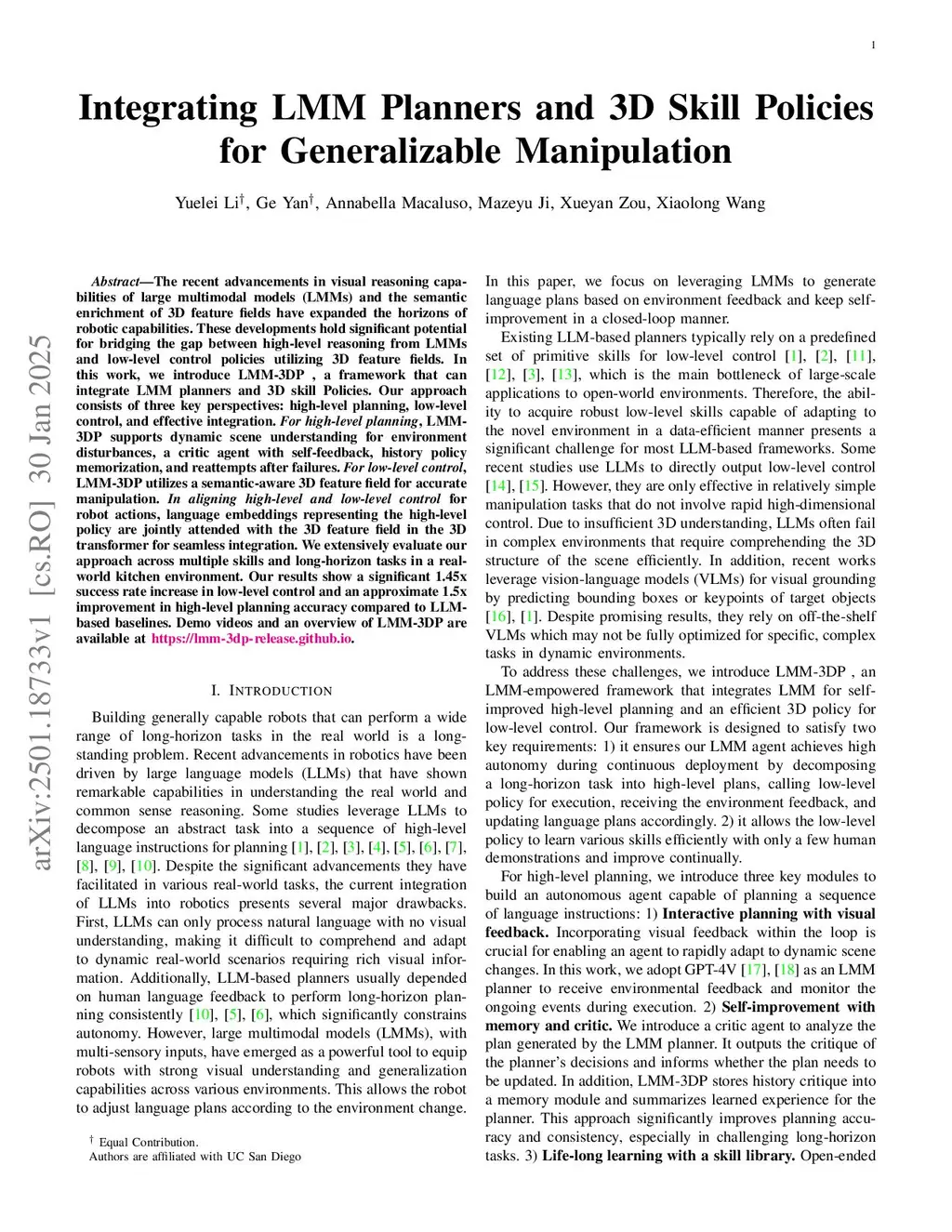 The recent advancements in visual reasoning capabilities of large multimodal models (LMMs) and the semantic enrichment of 3D feature fields have expanded the horizons of robotic capabilities. These developments hold significant potential for bridging the gap between high-level reasoning from LMMs and low-level control policies utilizing 3D feature fields. In this work, we introduce LMM-3DP, a framework that can integrate LMM planners and 3D skill Policies. Our approach consists of three key perspectives: high-level planning, low-level control, and effective integration. For high-level planning, LMM-3DP supports dynamic scene understanding for environment disturbances, a critic agent with self-feedback, history policy memorization, and reattempts after failures. For low-level control, LMM-3DP utilizes a semantic-aware 3D feature field for accurate manipulation. In aligning high-level and low-level control for robot actions, language embeddings representing the high-level policy are jointly attended with the 3D feature field in the 3D transformer for seamless integration. We extensively evaluate our approach across multiple skills and long-horizon tasks in a real-world kitchen environment. Our results show a significant 1.45x success rate increase in low-level control and an approximate 1.5x improvement in high-level planning accuracy compared to LLM-based baselines. Demo videos and an overview of LMM-3DP are available atthis https URL.