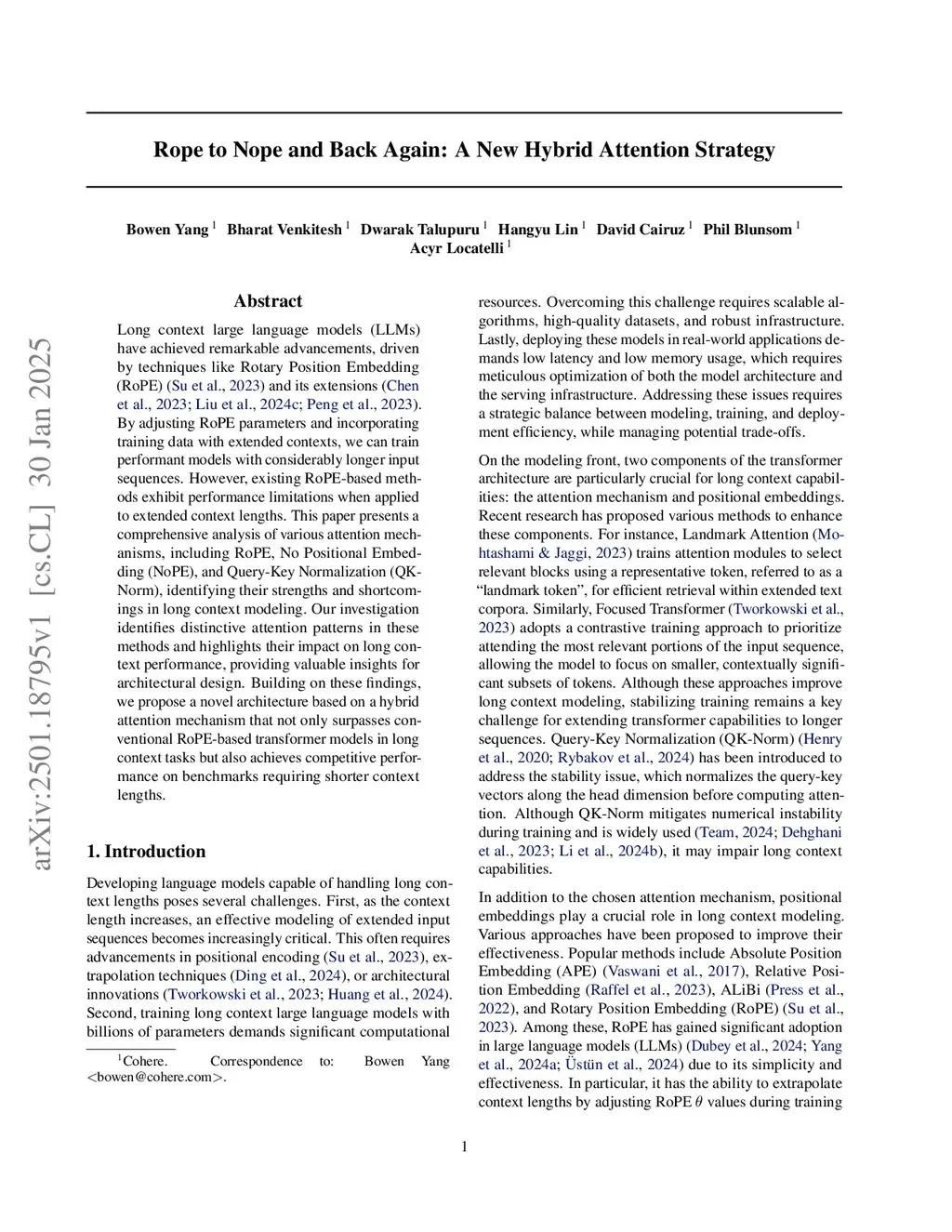 Long-context large language models (LLMs) have achieved remarkable advancements, driven by techniques like Rotary Position Embedding (RoPE) (Su et al., 2023) and its extensions (Chen et al., 2023; Liu et al., 2024c; Peng et al., 2023). By adjusting RoPE parameters and incorporating training data with extended contexts, we can train performant models with considerably longer input sequences. However, existing RoPE-based methods exhibit performance limitations when applied to extended context lengths. This paper presents a comprehensive analysis of various attention mechanisms, including RoPE, No Positional Embedding (NoPE), and Query-Key Normalization (QK-Norm), identifying their strengths and shortcomings in long-context modeling. Our investigation identifies distinctive attention patterns in these methods and highlights their impact on long-context performance, providing valuable insights for architectural design. Building on these findings, we propose a novel architecture featuring a hybrid attention mechanism that integrates global and local attention spans. This design not only surpasses conventional RoPE-based transformer models with full attention in both long and short context tasks but also delivers substantial efficiency gains during training and inference.