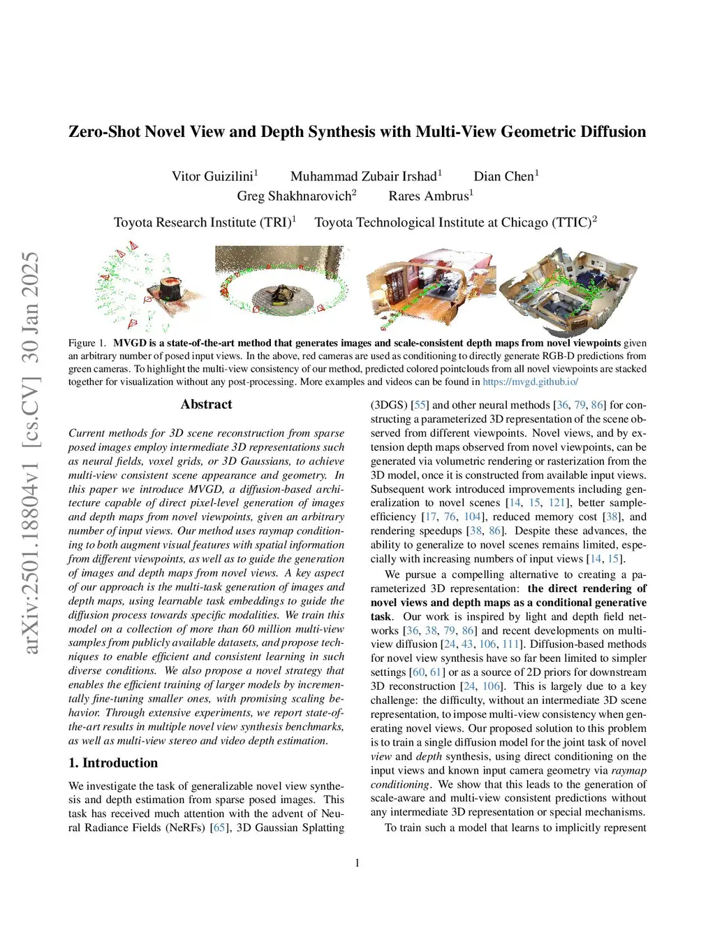 Current methods for 3D scene reconstruction from sparse posed images employ intermediate 3D representations such as neural fields, voxel grids, or 3D Gaussians, to achieve multi-view consistent scene appearance and geometry. In this paper we introduce MVGD, a diffusion-based architecture capable of direct pixel-level generation of images and depth maps from novel viewpoints, given an arbitrary number of input views. Our method uses raymap conditioning to both augment visual features with spatial information from different viewpoints, as well as to guide the generation of images and depth maps from novel views. A key aspect of our approach is the multi-task generation of images and depth maps, using learnable task embeddings to guide the diffusion process towards specific modalities. We train this model on a collection of more than 60 million multi-view samples from publicly available datasets, and propose techniques to enable efficient and consistent learning in such diverse conditions. We also propose a novel strategy that enables the efficient training of larger models by incrementally fine-tuning smaller ones, with promising scaling behavior. Through extensive experiments, we report state-of-the-art results in multiple novel view synthesis benchmarks, as well as multi-view stereo and video depth estimation.