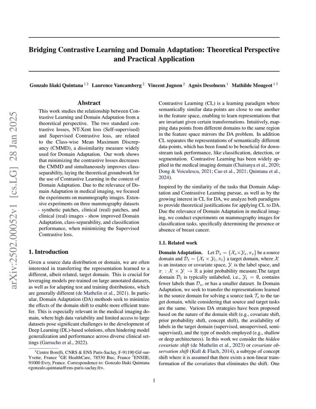 This work studies the relationship between Contrastive Learning and Domain Adaptation from a theoretical perspective. The two standard contrastive losses, NT-Xent loss (Self-supervised) and Supervised Contrastive loss, are related to the Class-wise Mean Maximum Discrepancy (CMMD), a dissimilarity measure widely used for Domain Adaptation. Our work shows that minimizing the contrastive losses decreases the CMMD and simultaneously improves class-separability, laying the theoretical groundwork for the use of Contrastive Learning in the context of Domain Adaptation. Due to the relevance of Domain Adaptation in medical imaging, we focused the experiments on mammography images. Extensive experiments on three mammography datasets - synthetic patches, clinical (real) patches, and clinical (real) images - show improved Domain Adaptation, class-separability, and classification performance, when minimizing the Supervised Contrastive loss.