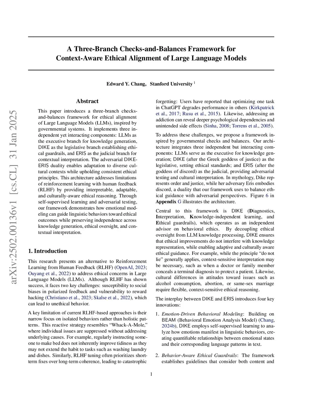 This paper introduces a checks-and-balances framework for ethical alignment of Large Language Models (LLMs), inspired by three-branch governmental systems. It implements three independent yet interacting components: LLMs as the executive branch for knowledge generation, DIKE as the legislative branch establishing ethical guardrails, and ERIS as the judicial branch for contextual interpretation. Beyond structural separation, we address a fundamental challenge: regulating emotion to shape behaviors. Drawing from psychological theories where managing emotional responses prevents harmful behaviors, we develop a self-supervised learning pipeline that maps emotions to linguistic behaviors, enabling precise behavioral modulation through emotional conditioning. By integrating this approach with adversarial testing, our framework demonstrates how DIKE and ERIS direct linguistic behaviors toward ethical outcomes while preserving independence throughout knowledge generation, ethical oversight, and contextual interpretation.