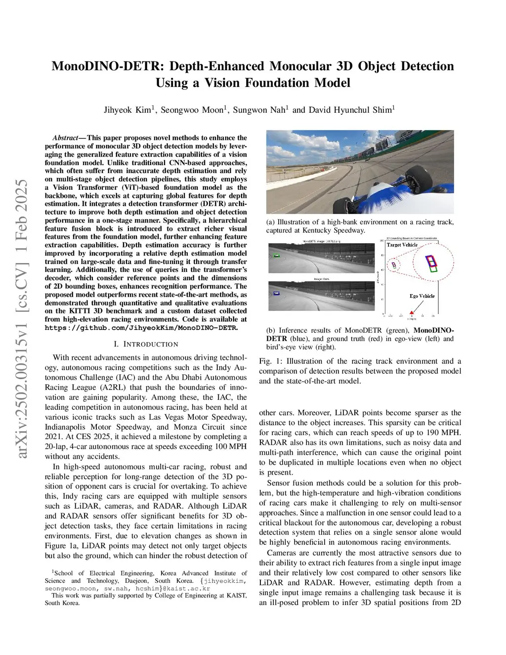 This paper proposes novel methods to enhance the performance of monocular 3D object detection models by leveraging the generalized feature extraction capabilities of a vision foundation model. Unlike traditional CNN-based approaches, which often suffer from inaccurate depth estimation and rely on multi-stage object detection pipelines, this study employs a Vision Transformer (ViT)-based foundation model as the backbone, which excels at capturing global features for depth estimation. It integrates a detection transformer (DETR) architecture to improve both depth estimation and object detection performance in a one-stage manner. Specifically, a hierarchical feature fusion block is introduced to extract richer visual features from the foundation model, further enhancing feature extraction capabilities. Depth estimation accuracy is further improved by incorporating a relative depth estimation model trained on large-scale data and fine-tuning it through transfer learning. Additionally, the use of queries in the transformer's decoder, which consider reference points and the dimensions of 2D bounding boxes, enhances recognition performance. The proposed model outperforms recent state-of-the-art methods, as demonstrated through quantitative and qualitative evaluations on the KITTI 3D benchmark and a custom dataset collected from high-elevation racing environments. Code is available atthis https URL.
