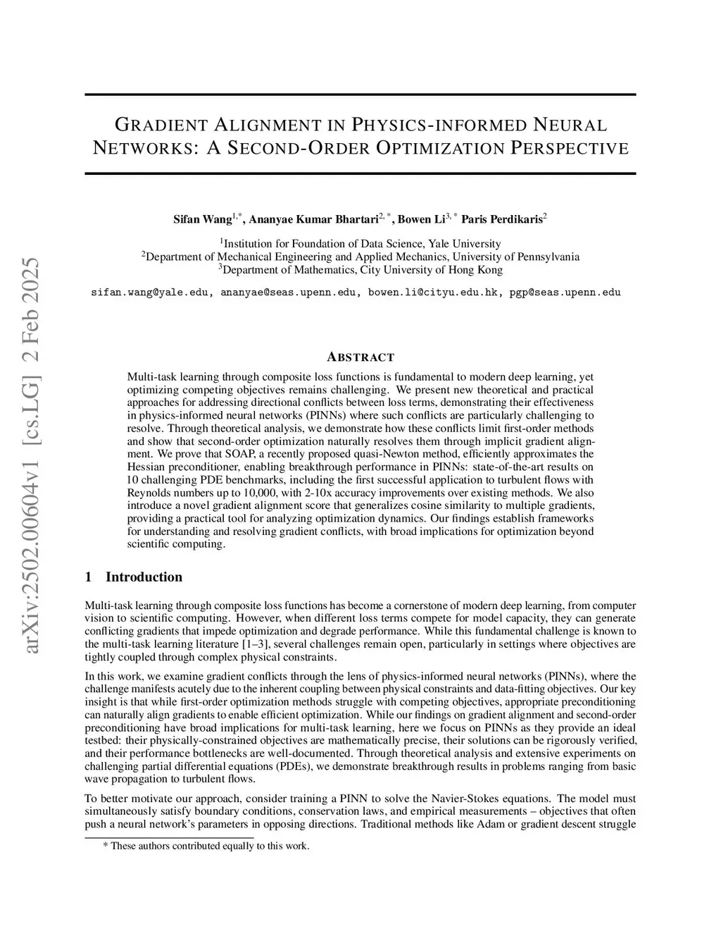 Multi-task learning through composite loss functions is fundamental to modern deep learning, yet optimizing competing objectives remains challenging. We present new theoretical and practical approaches for addressing directional conflicts between loss terms, demonstrating their effectiveness in physics-informed neural networks (PINNs) where such conflicts are particularly challenging to resolve. Through theoretical analysis, we demonstrate how these conflicts limit first-order methods and show that second-order optimization naturally resolves them through implicit gradient alignment. We prove that SOAP, a recently proposed quasi-Newton method, efficiently approximates the Hessian preconditioner, enabling breakthrough performance in PINNs: state-of-the-art results on 10 challenging PDE benchmarks, including the first successful application to turbulent flows with Reynolds numbers up to 10,000, with 2-10x accuracy improvements over existing methods. We also introduce a novel gradient alignment score that generalizes cosine similarity to multiple gradients, providing a practical tool for analyzing optimization dynamics. Our findings establish frameworks for understanding and resolving gradient conflicts, with broad implications for optimization beyond scientific computing.