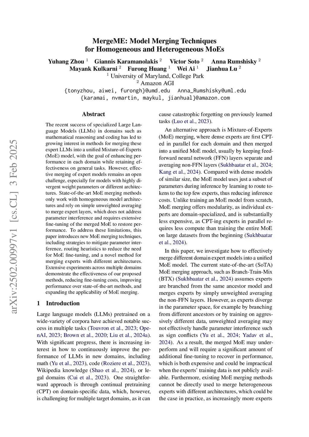 The recent success of specialized Large Language Models (LLMs) in domains such as mathematical reasoning and coding has led to growing interest in methods for merging these expert LLMs into a unified Mixture-of-Experts (MoE) model, with the goal of enhancing performance in each domain while retaining effectiveness on general tasks. However, the effective merging of expert models remains an open challenge, especially for models with highly divergent weight parameters or different architectures. State-of-the-art MoE merging methods only work with homogeneous model architectures and rely on simple unweighted averaging to merge expert layers, which does not address parameter interference and requires extensive fine-tuning of the merged MoE to restore performance. To address these limitations, this paper introduces new MoE merging techniques, including strategies to mitigate parameter interference, routing heuristics to reduce the need for MoE fine-tuning, and a novel method for merging experts with different architectures. Extensive experiments across multiple domains demonstrate the effectiveness of our proposed methods, reducing fine-tuning costs, improving performance over state-of-the-art methods, and expanding the applicability of MoE merging.