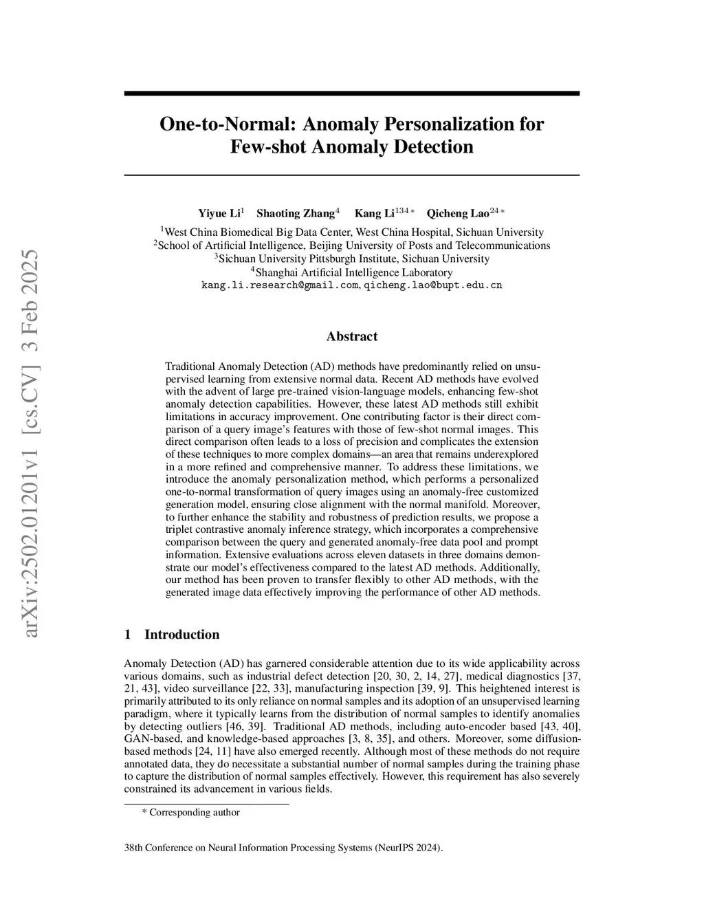 Traditional Anomaly Detection (AD) methods have predominantly relied on unsupervised learning from extensive normal data. Recent AD methods have evolved with the advent of large pre-trained vision-language models, enhancing few-shot anomaly detection capabilities. However, these latest AD methods still exhibit limitations in accuracy improvement. One contributing factor is their direct comparison of a query image's features with those of few-shot normal images. This direct comparison often leads to a loss of precision and complicates the extension of these techniques to more complex domains--an area that remains underexplored in a more refined and comprehensive manner. To address these limitations, we introduce the anomaly personalization method, which performs a personalized one-to-normal transformation of query images using an anomaly-free customized generation model, ensuring close alignment with the normal manifold. Moreover, to further enhance the stability and robustness of prediction results, we propose a triplet contrastive anomaly inference strategy, which incorporates a comprehensive comparison between the query and generated anomaly-free data pool and prompt information. Extensive evaluations across eleven datasets in three domains demonstrate our model's effectiveness compared to the latest AD methods. Additionally, our method has been proven to transfer flexibly to other AD methods, with the generated image data effectively improving the performance of other AD methods.