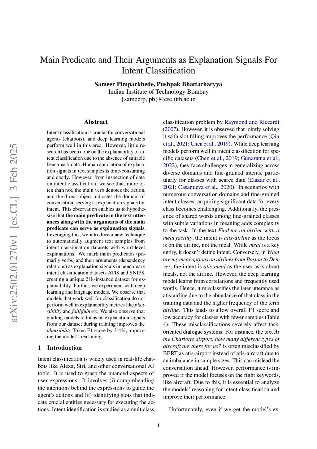 Main Predicate and Their Arguments as Explanation Signals For Intent Classification
