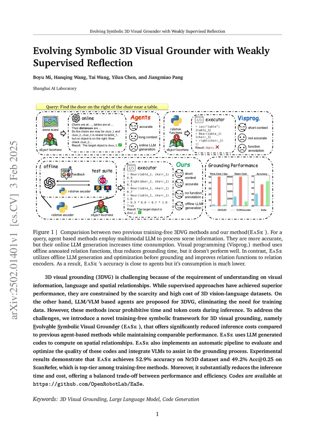 3D visual grounding (3DVG) is challenging due to the need to understand 3D spatial relations. While supervised approaches have achieved superior performance, they are constrained by the scarcity and high annotation costs of 3D vision-language datasets. Training-free approaches based on LLMs/VLMs eliminate the need for large-scale training data, but they either incur prohibitive grounding time and token costs or have unsatisfactory accuracy. To address the challenges, we introduce a novel method for training-free 3D visual grounding, namely Language-to-Space Programming (LaSP). LaSP introduces LLM-generated codes to analyze 3D spatial relations among objects, along with a pipeline that evaluates and optimizes the codes automatically. Experimental results demonstrate that LaSP achieves 52.9% accuracy on the Nr3D benchmark, ranking among the best training-free methods. Moreover, it substantially reduces the grounding time and token costs, offering a balanced trade-off between performance and efficiency.