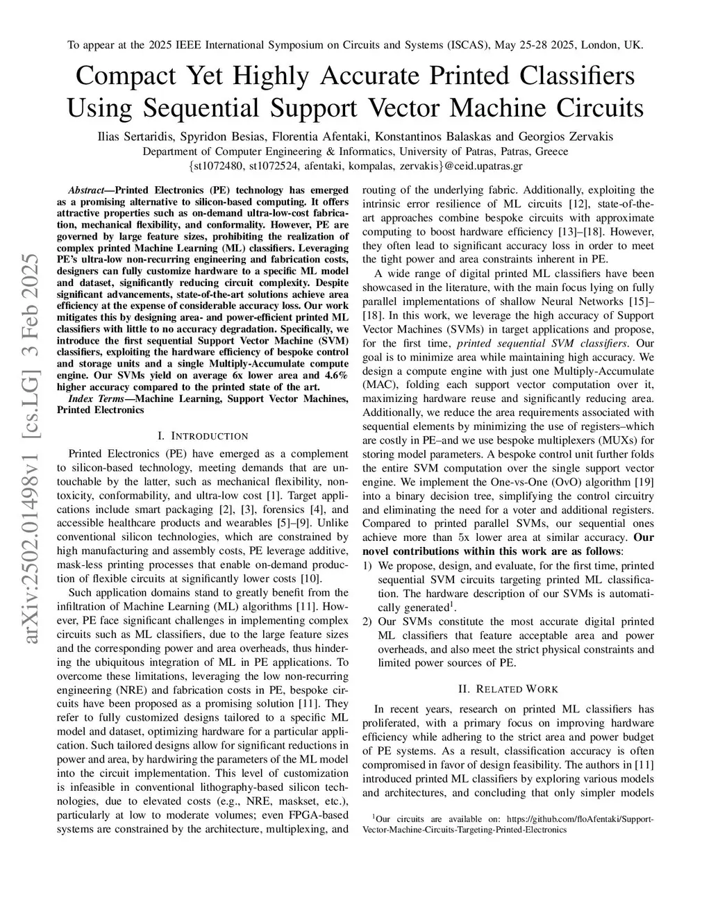 Printed Electronics (PE) technology has emerged as a promising alternative to silicon-based computing. It offers attractive properties such as on-demand ultra-low-cost fabrication, mechanical flexibility, and conformality. However, PE are governed by large feature sizes, prohibiting the realization of complex printed Machine Learning (ML) classifiers. Leveraging PE's ultra-low non-recurring engineering and fabrication costs, designers can fully customize hardware to a specific ML model and dataset, significantly reducing circuit complexity. Despite significant advancements, state-of-the-art solutions achieve area efficiency at the expense of considerable accuracy loss. Our work mitigates this by designing area- and power-efficient printed ML classifiers with little to no accuracy degradation. Specifically, we introduce the first sequential Support Vector Machine (SVM) classifiers, exploiting the hardware efficiency of bespoke control and storage units and a single Multiply-Accumulate compute engine. Our SVMs yield on average 6x lower area and 4.6% higher accuracy compared to the printed state of the art.