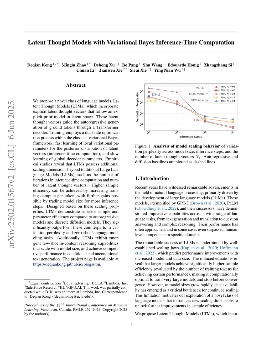 We propose a novel class of language models, Latent Thought Models (LTMs), which incorporate explicit latent thought vectors that follow an explicit prior model in latent space. These latent thought vectors guide the autoregressive generation of ground tokens through a Transformer decoder. Training employs a dual-rate optimization process within the classical variational Bayes framework: fast learning of local variational parameters for the posterior distribution of latent vectors (inference-time computation), and slow learning of global decoder parameters. Empirical studies reveal that LTMs possess additional scaling dimensions beyond traditional Large Language Models (LLMs), such as the number of iterations in inference-time computation and number of latent thought vectors. Higher sample efficiency can be achieved by increasing training compute per token, with further gains possible by trading model size for more inference steps. Designed based on these scaling properties, LTMs demonstrate superior sample and parameter efficiency compared to autoregressive models and discrete diffusion models. They significantly outperform these counterparts in validation perplexity and zero-shot language modeling tasks. Additionally, LTMs exhibit emergent few-shot in-context reasoning capabilities that scale with model size, and achieve competitive performance in conditional and unconditional text generation.