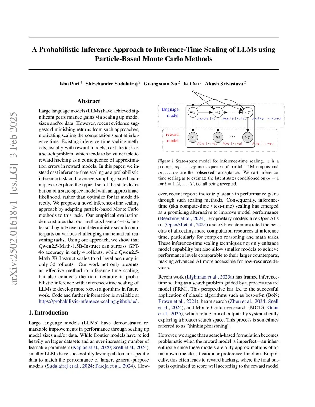 Large language models (LLMs) have achieved significant performance gains via scaling up model sizes and/or data. However, recent evidence suggests diminishing returns from such approaches, motivating scaling the computation spent at inference time. Existing inference-time scaling methods, usually with reward models, cast the task as a search problem, which tends to be vulnerable to reward hacking as a consequence of approximation errors in reward models. In this paper, we instead cast inference-time scaling as a probabilistic inference task and leverage sampling-based techniques to explore the typical set of the state distribution of a state-space model with an approximate likelihood, rather than optimize for its mode directly. We propose a novel inference-time scaling approach by adapting particle-based Monte Carlo methods to this task. Our empirical evaluation demonstrates that our methods have a 4-16x better scaling rate over our deterministic search counterparts on various challenging mathematical reasoning tasks. Using our approach, we show that Qwen2.5-Math-1.5B-Instruct can surpass GPT-4o accuracy in only 4 rollouts, while Qwen2.5-Math-7B-Instruct scales to o1 level accuracy in only 32 rollouts. Our work not only presents an effective method to inference-time scaling, but also connects the rich literature in probabilistic inference with inference-time scaling of LLMs to develop more robust algorithms in future work. Code, videos, and further information available atthis https URL.