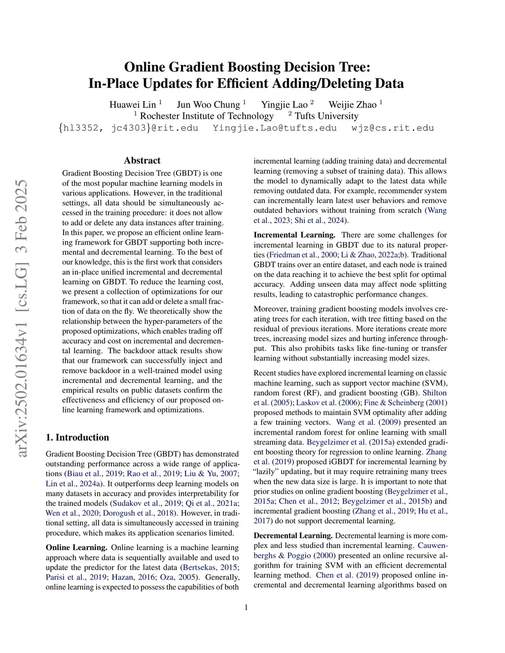 Gradient Boosting Decision Tree (GBDT) is one of the most popular machine learning models in various applications. However, in the traditional settings, all data should be simultaneously accessed in the training procedure: it does not allow to add or delete any data instances after training. In this paper, we propose an efficient online learning framework for GBDT supporting both incremental and decremental learning. To the best of our knowledge, this is the first work that considers an in-place unified incremental and decremental learning on GBDT. To reduce the learning cost, we present a collection of optimizations for our framework, so that it can add or delete a small fraction of data on the fly. We theoretically show the relationship between the hyper-parameters of the proposed optimizations, which enables trading off accuracy and cost on incremental and decremental learning. The backdoor attack results show that our framework can successfully inject and remove backdoor in a well-trained model using incremental and decremental learning, and the empirical results on public datasets confirm the effectiveness and efficiency of our proposed online learning framework and optimizations.