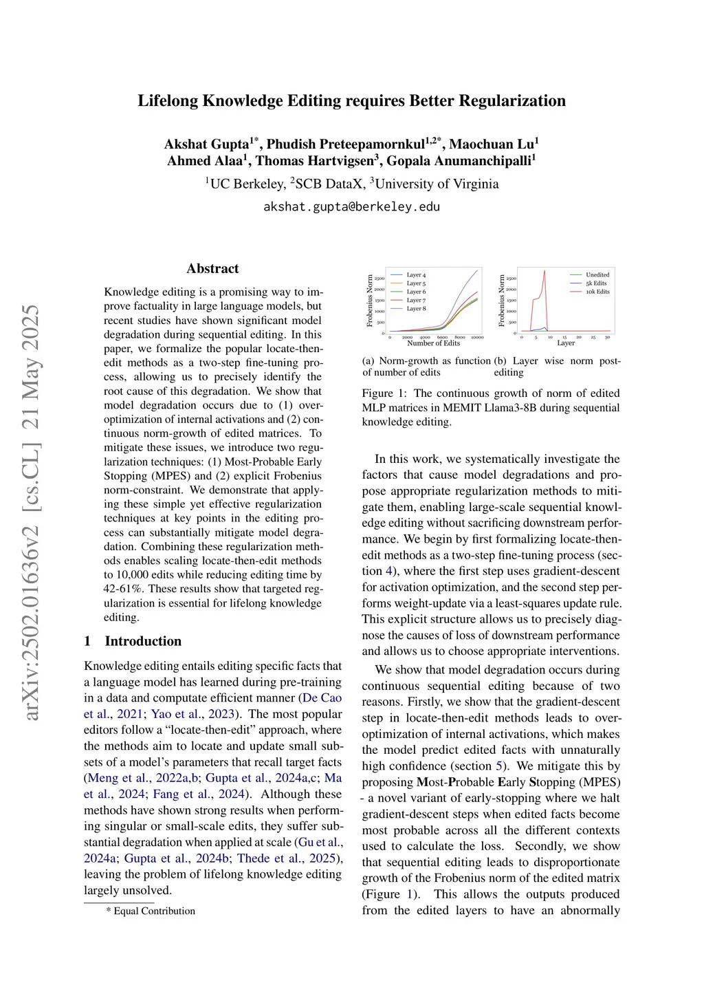 Knowledge editing is a promising way to improve factuality in large language models, but recent studies have shown significant model degradation during sequential editing. In this paper, we formalize the popular locate-then-edit methods as a two-step fine-tuning process, allowing us to precisely identify the root cause of this degradation. We show that model degradation occurs due to (1) over-optimization of internal activations and (2) continuous norm-growth of edited matrices. To mitigate these issues, we introduce two regularization techniques: (1) Most-Probable Early Stopping (MPES) and (2) explicit Frobenius norm-constraint. We demonstrate that applying these simple yet effective regularization techniques at key points in the editing process can substantially mitigate model degradation. Combining these regularization methods enables scaling locate-then-edit methods to 10,000 edits while reducing editing time by 42-61%. These results show that targeted regularization is essential for lifelong knowledge editing.