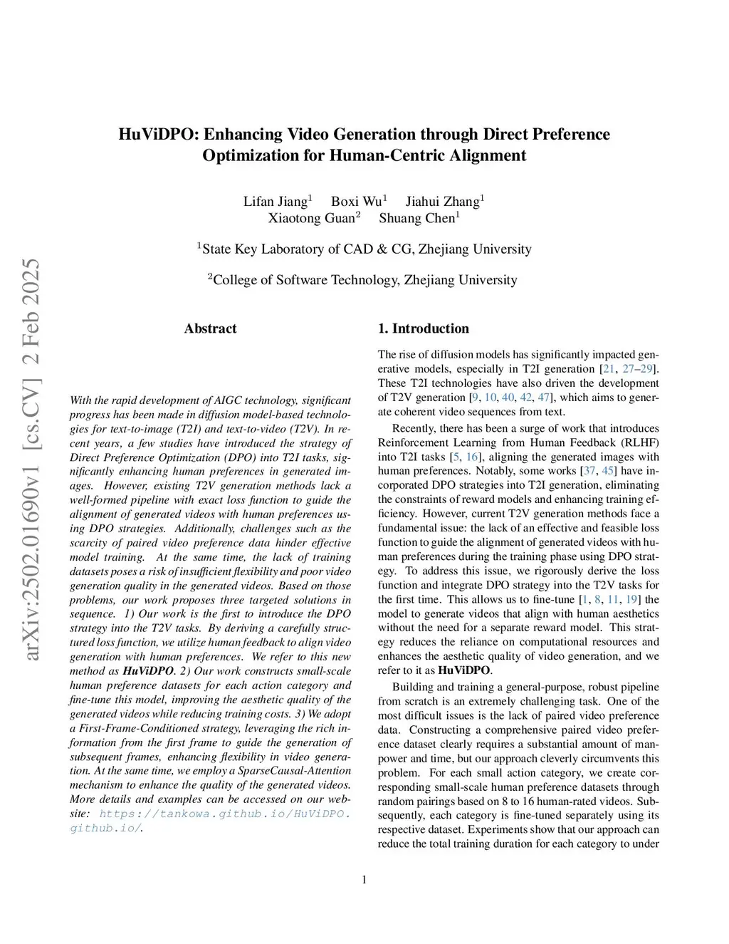 With the rapid development of AIGC technology, significant progress has been made in diffusion model-based technologies for text-to-image (T2I) and text-to-video (T2V). In recent years, a few studies have introduced the strategy of Direct Preference Optimization (DPO) into T2I tasks, significantly enhancing human preferences in generated images. However, existing T2V generation methods lack a well-formed pipeline with exact loss function to guide the alignment of generated videos with human preferences using DPO strategies. Additionally, challenges such as the scarcity of paired video preference data hinder effective model training. At the same time, the lack of training datasets poses a risk of insufficient flexibility and poor video generation quality in the generated videos. Based on those problems, our work proposes three targeted solutions in sequence. 1) Our work is the first to introduce the DPO strategy into the T2V tasks. By deriving a carefully structured loss function, we utilize human feedback to align video generation with human preferences. We refer to this new method as HuViDPO. 2) Our work constructs small-scale human preference datasets for each action category and fine-tune this model, improving the aesthetic quality of the generated videos while reducing training costs. 3) We adopt a First-Frame-Conditioned strategy, leveraging the rich in formation from the first frame to guide the generation of subsequent frames, enhancing flexibility in video generation. At the same time, we employ a SparseCausal Attention mechanism to enhance the quality of the generatedthis http URLdetails and examples can be accessed on our website:this https URL.this http URL.