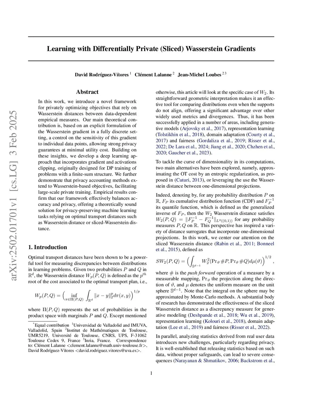 In this work, we introduce a novel framework for privately optimizing objectives that rely on Wasserstein distances between data-dependent empirical measures. Our main theoretical contribution is, based on an explicit formulation of the Wasserstein gradient in a fully discrete setting, a control on the sensitivity of this gradient to individual data points, allowing strong privacy guarantees at minimal utility cost. Building on these insights, we develop a deep learning approach that incorporates gradient and activations clipping, originally designed for DP training of problems with a finite-sum structure. We further demonstrate that privacy accounting methods extend to Wasserstein-based objectives, facilitating large-scale private training. Empirical results confirm that our framework effectively balances accuracy and privacy, offering a theoretically sound solution for privacy-preserving machine learning tasks relying on optimal transport distances such as Wasserstein distance or sliced-Wasserstein distance.