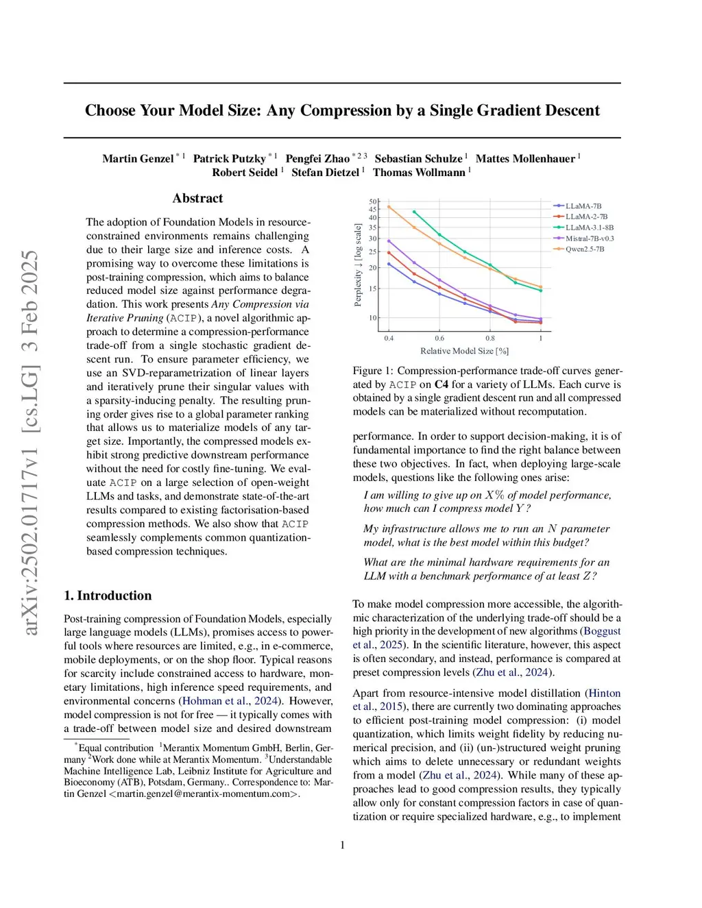 The adoption of Foundation Models in resource-constrained environments remains challenging due to their large size and inference costs. A promising way to overcome these limitations is post-training compression, which aims to balance reduced model size against performance degradation. This work presents Any Compression via Iterative Pruning (ACIP), a novel algorithmic approach to determine a compression-performance trade-off from a single stochastic gradient descent run. To achieve parameter efficiency, we use an SVD-reparametrization of linear layers and iteratively prune their singular values with a sparsity-inducing penalty. Importantly, the pruning order of the parameters is used to derive a global score map that allows compressing a model to any target size without re-computation. We evaluate ACIP on a large selection of open-weight LLMs and downstream tasks, demonstrating state-of-the-art results compared to existing factorization-based compression methods. We also show that ACIP seamlessly complements common quantization-based compression techniques.