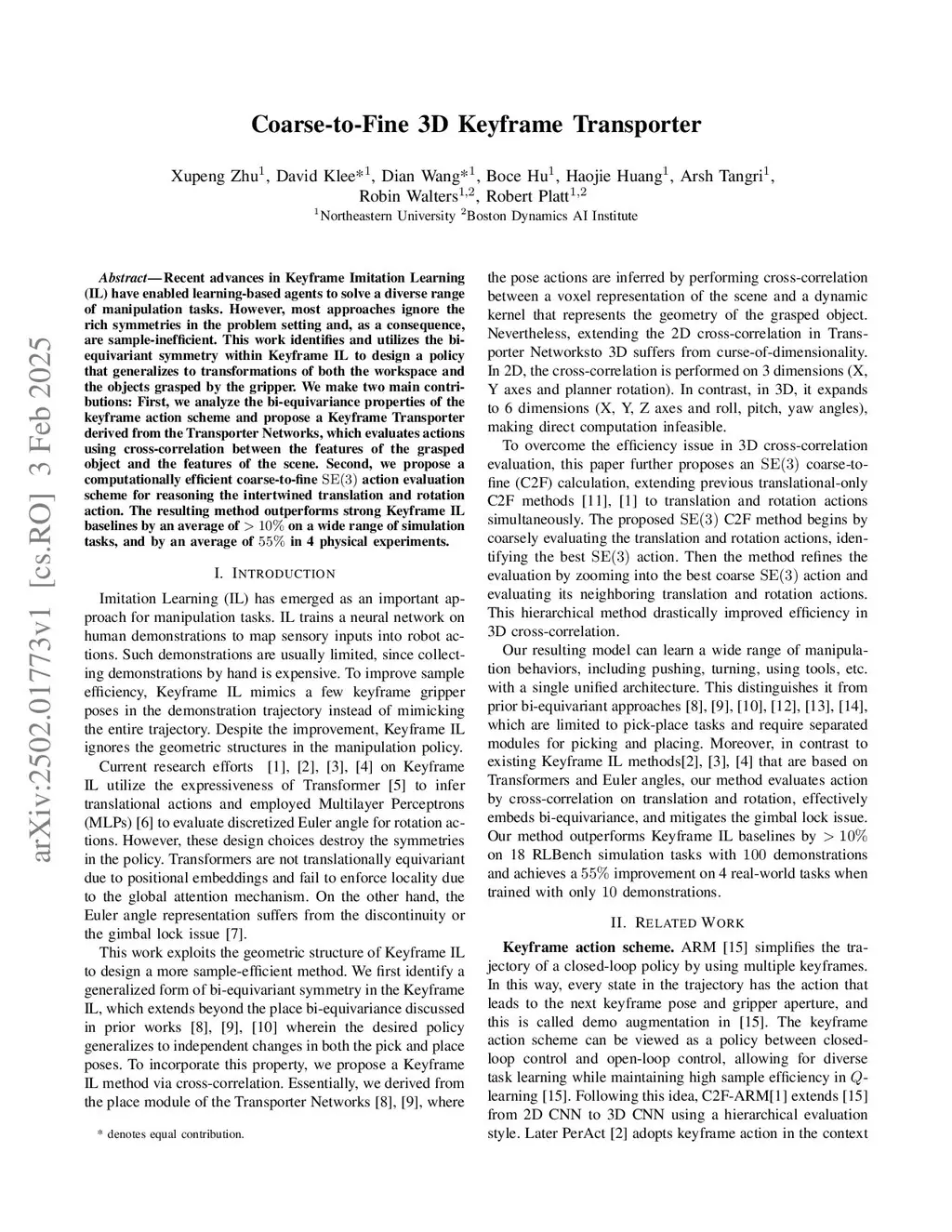 Recent advances in Keyframe Imitation Learning (IL) have enabled learning-based agents to solve a diverse range of manipulation tasks. However, most approaches ignore the rich symmetries in the problem setting and, as a consequence, are sample-inefficient. This work identifies and utilizes the bi-equivariant symmetry within Keyframe IL to design a policy that generalizes to transformations of both the workspace and the objects grasped by the gripper. We make two main contributions: First, we analyze the bi-equivariance properties of the keyframe action scheme and propose a Keyframe Transporter derived from the Transporter Networks, which evaluates actions using cross-correlation between the features of the grasped object and the features of the scene. Second, we propose a computationally efficient coarse-to-fine SE(3) action evaluation scheme for reasoning the intertwined translation and rotation action. The resulting method outperforms strong Keyframe IL baselines by an average of >10% on a wide range of simulation tasks, and by an average of 55% in 4 physical experiments.