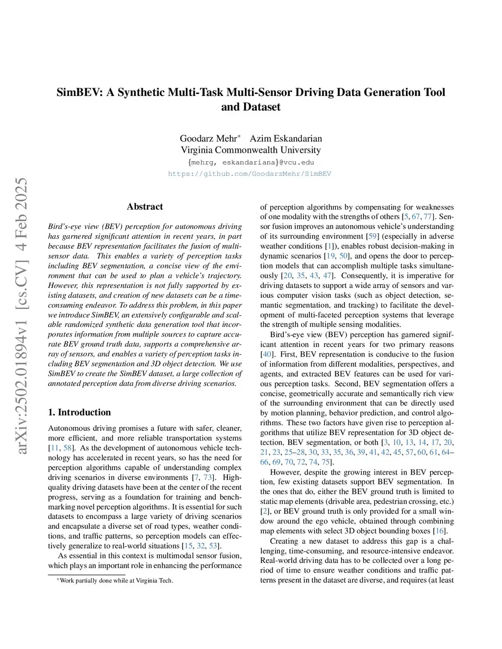 Bird's-eye view (BEV) perception has garnered significant attention in autonomous driving in recent years, in part because BEV representation facilitates multi-modal sensor fusion. BEV representation enables a variety of perception tasks including BEV segmentation, a concise view of the environment useful for planning a vehicle's trajectory. However, this representation is not fully supported by existing datasets, and creation of new datasets for this purpose can be a time-consuming endeavor. To address this challenge, we introduce SimBEV. SimBEV is a randomized synthetic data generation tool that is extensively configurable and scalable, supports a wide array of sensors, incorporates information from multiple sources to capture accurate BEV ground truth, and enables a variety of perception tasks including BEV segmentation and 3D object detection. SimBEV is used to create the SimBEV dataset, a large collection of annotated perception data from diverse driving scenarios. SimBEV and the SimBEV dataset are open and available to the public.