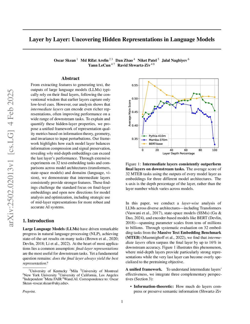 From extracting features to generating text, the outputs of large language models (LLMs) typically rely on the final layers, following the conventional wisdom that earlier layers capture only low-level cues. However, our analysis shows that intermediate layers can encode even richer representations, often improving performance on a range of downstream tasks. To explain and quantify these hidden-layer properties, we propose a unified framework of representation quality metrics based on information theory, geometry, and invariance to input perturbations. Our framework highlights how each layer balances information compression and signal preservation, revealing why mid-depth embeddings can exceed the last layer's performance. Through extensive experiments on 32 text-embedding tasks across various architectures (transformers, state-space models) and domains (language, vision), we demonstrate that intermediate layers consistently provide stronger features, challenging the standard view on final-layer embeddings and opening new directions on using mid-layer representations for more robust and accurate representations.