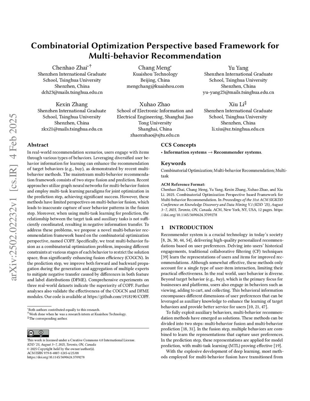 In real-world recommendation scenarios, users engage with items through various types of behaviors. Leveraging diversified user behavior information for learning can enhance the recommendation of target behaviors (e.g., buy), as demonstrated by recent multi-behavior methods. The mainstream multi-behavior recommendation framework consists of two steps: fusion and prediction. Recent approaches utilize graph neural networks for multi-behavior fusion and employ multi-task learning paradigms for joint optimization in the prediction step, achieving significant success. However, these methods have limited perspectives on multi-behavior fusion, which leads to inaccurate capture of user behavior patterns in the fusion step. Moreover, when using multi-task learning for prediction, the relationship between the target task and auxiliary tasks is not sufficiently coordinated, resulting in negative information transfer. To address these problems, we propose a novel multi-behavior recommendation framework based on the combinatorial optimization perspective, named COPF. Specifically, we treat multi-behavior fusion as a combinatorial optimization problem, imposing different constraints at various stages of each behavior to restrict the solution space, thus significantly enhancing fusion efficiency (COGCN). In the prediction step, we improve both forward and backward propagation during the generation and aggregation of multiple experts to mitigate negative transfer caused by differences in both feature and label distributions (DFME). Comprehensive experiments on three real-world datasets indicate the superiority of COPF. Further analyses also validate the effectiveness of the COGCN and DFME modules. Our code is available atthis https URL.