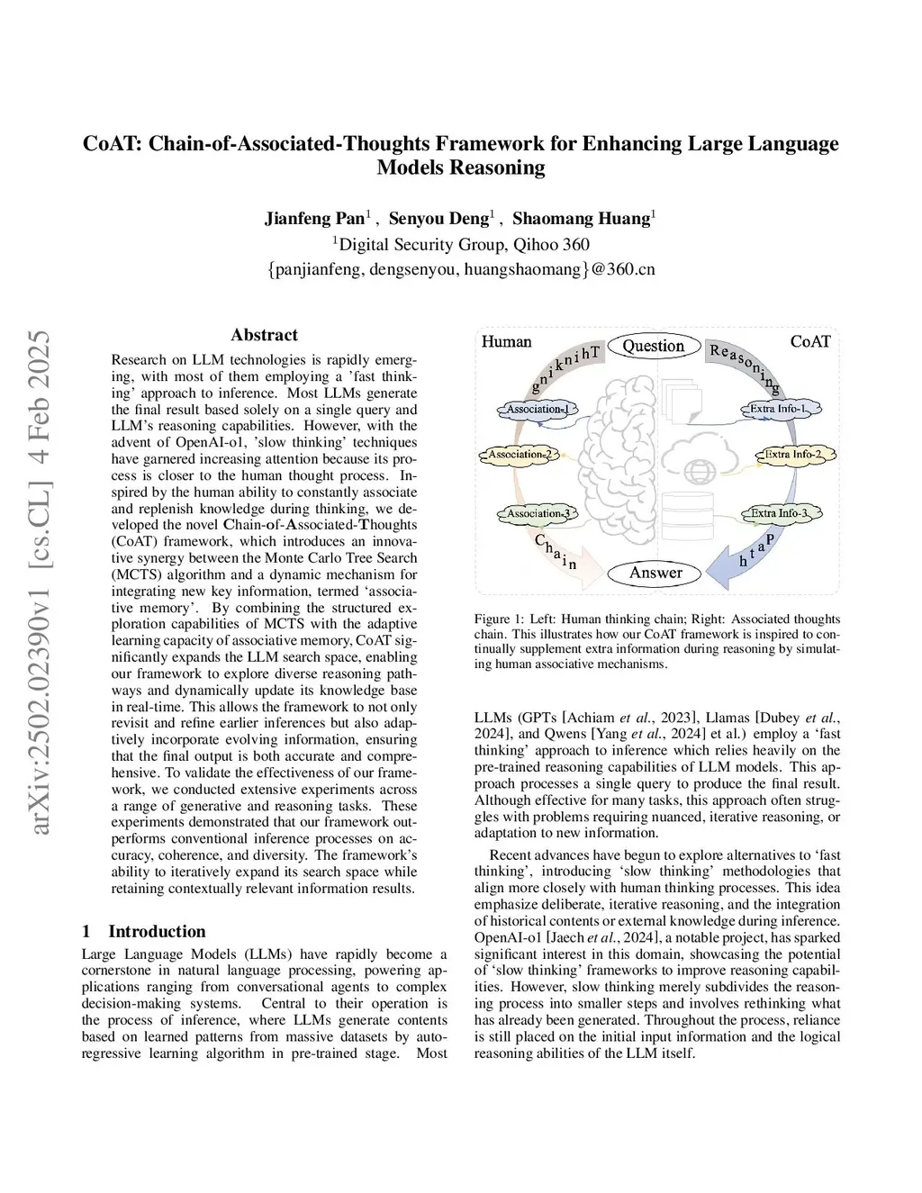 Research on LLM technologies is rapidly emerging, with most of them employ a 'fast thinking' approach to inference. Most LLMs generate the final result based solely on a single query and LLM's reasoning capabilities. However, with the advent of OpenAI-o1, 'slow thinking' techniques have garnered increasing attention because its process is closer to the human thought process. Inspired by the human ability to constantly associate and replenish knowledge during thinking, we developed the novel Chain-of-Associated-Thoughts (CoAT) framework, which introduces an innovative synergy between the Monte Carlo Tree Search (MCTS) algorithm and a dynamic mechanism for integrating new key information, termed ássociative memory'. By combining the structured exploration capabilities of MCTS with the adaptive learning capacity of associative memory, CoAT significantly expands the LLM search space, enabling our framework to explore diverse reasoning pathways and dynamically update its knowledge base in real-time. This allows the framework to not only revisit and refine earlier inferences but also adaptively incorporate evolving information, ensuring that the final output is both accurate and comprehensive. We validate CoAT's effectiveness across a variety of generative and reasoning tasks. Quantitative experiments show that CoAT achieves over 10% performance improvement on open-source multi-hop reasoning datasets (HotpotQA, MuSiQue) and more than 15% gain on our proprietary CRB dataset.