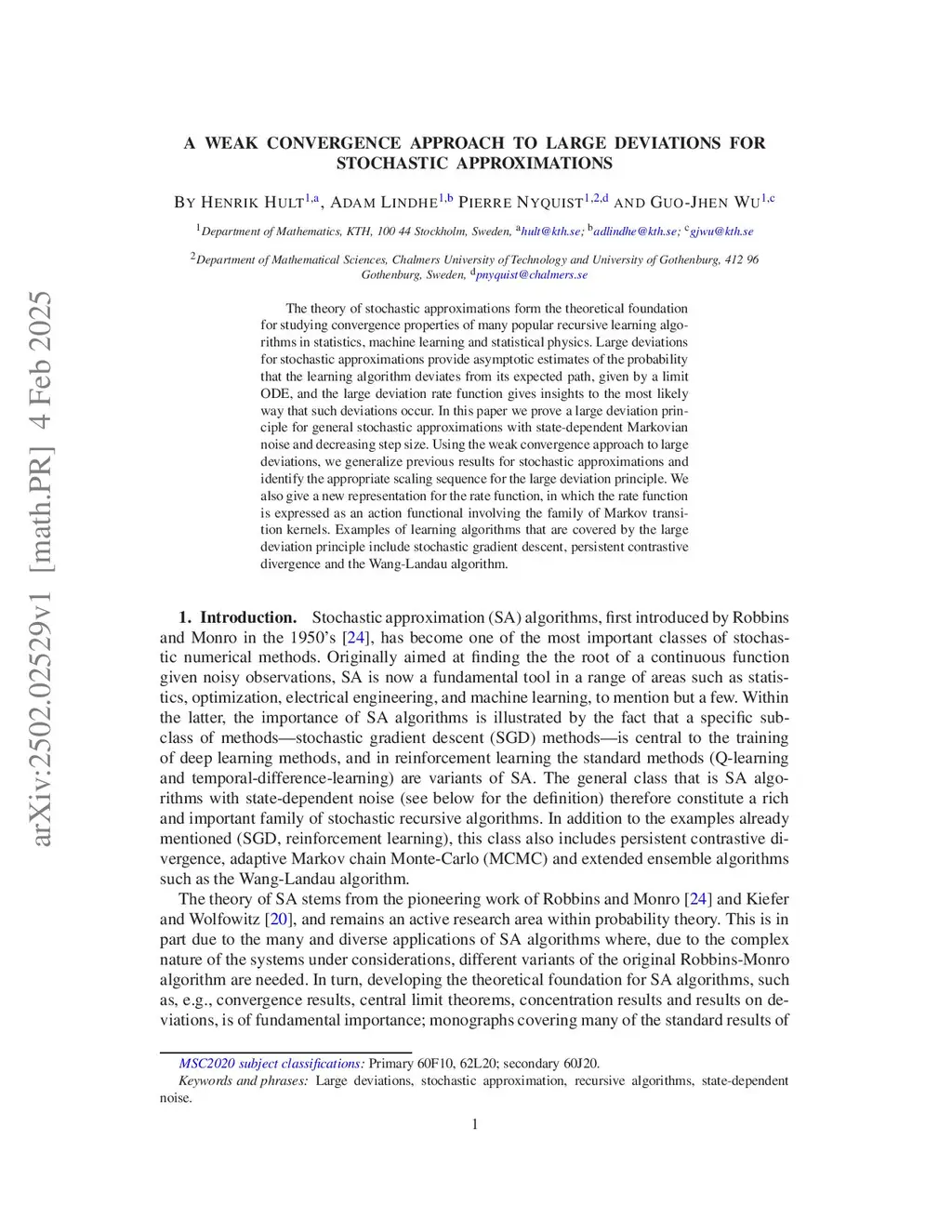 The theory of stochastic approximations form the theoretical foundation for studying convergence properties of many popular recursive learning algorithms in statistics, machine learning and statistical physics. Large deviations for stochastic approximations provide asymptotic estimates of the probability that the learning algorithm deviates from its expected path, given by a limit ODE, and the large deviation rate function gives insights to the most likely way that such deviations occur.In this paper we prove a large deviation principle for general stochastic approximations with state-dependent Markovian noise and decreasing step size. Using the weak convergence approach to large deviations, we generalize previous results for stochastic approximations and identify the appropriate scaling sequence for the large deviation principle. We also give a new representation for the rate function, in which the rate function is expressed as an action functional involving the family of Markov transition kernels. Examples of learning algorithms that are covered by the large deviation principle include stochastic gradient descent, persistent contrastive divergence and the Wang-Landau algorithm.