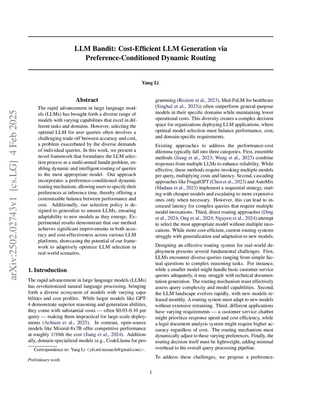 LLM Bandit: Cost-Efficient LLM Generation via Preference-Conditioned Dynamic Routing