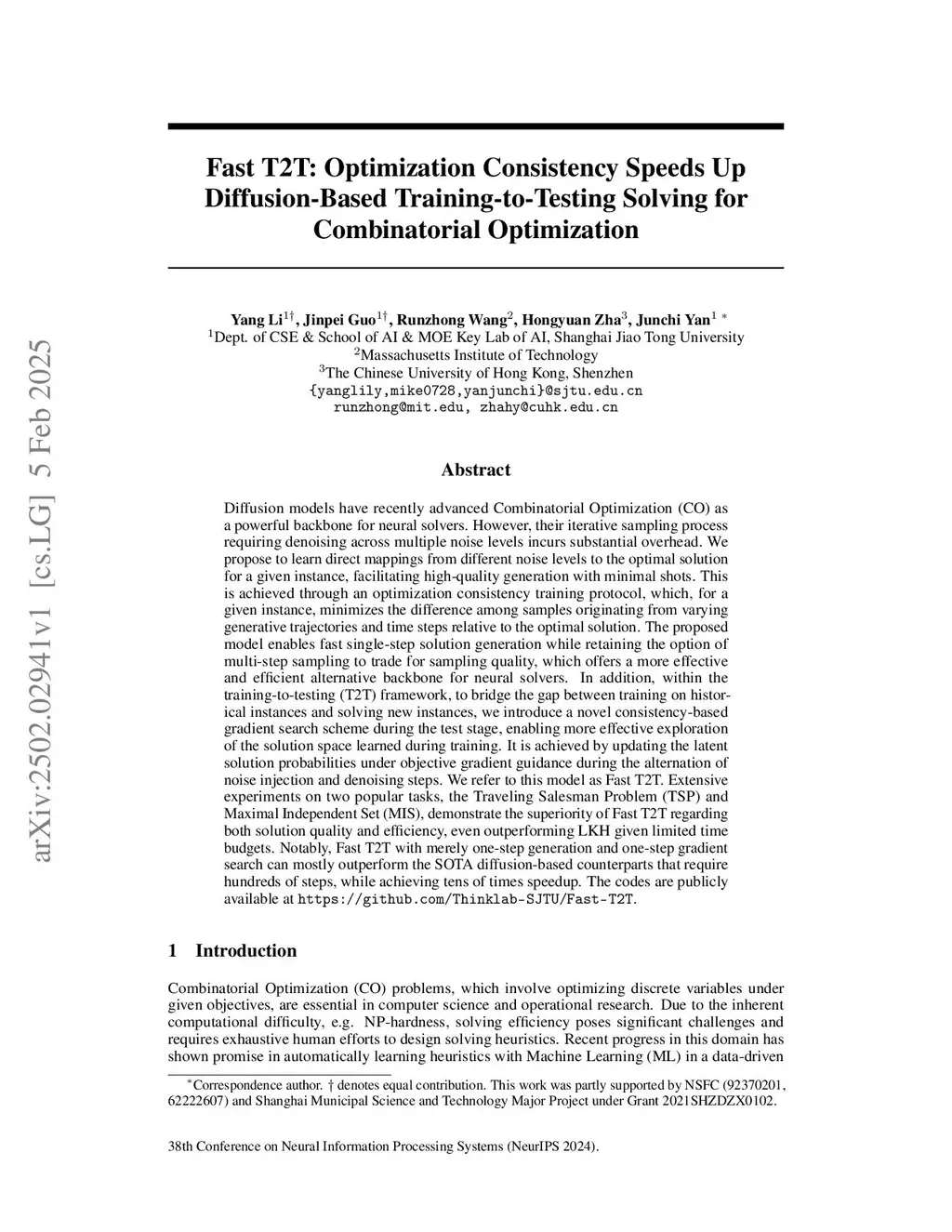 Diffusion models have recently advanced Combinatorial Optimization (CO) as a powerful backbone for neural solvers. However, their iterative sampling process requiring denoising across multiple noise levels incurs substantial overhead. We propose to learn direct mappings from different noise levels to the optimal solution for a given instance, facilitating high-quality generation with minimal shots. This is achieved through an optimization consistency training protocol, which, for a given instance, minimizes the difference among samples originating from varying generative trajectories and time steps relative to the optimal solution. The proposed model enables fast single-step solution generation while retaining the option of multi-step sampling to trade for sampling quality, which offers a more effective and efficient alternative backbone for neural solvers. In addition, within the training-to-testing (T2T) framework, to bridge the gap between training on historical instances and solving new instances, we introduce a novel consistency-based gradient search scheme during the test stage, enabling more effective exploration of the solution space learned during training. It is achieved by updating the latent solution probabilities under objective gradient guidance during the alternation of noise injection and denoising steps. We refer to this model as Fast T2T. Extensive experiments on two popular tasks, the Traveling Salesman Problem (TSP) and Maximal Independent Set (MIS), demonstrate the superiority of Fast T2T regarding both solution quality and efficiency, even outperforming LKH given limited time budgets. Notably, Fast T2T with merely one-step generation and one-step gradient search can mostly outperform the SOTA diffusion-based counterparts that require hundreds of steps, while achieving tens of times speedup.