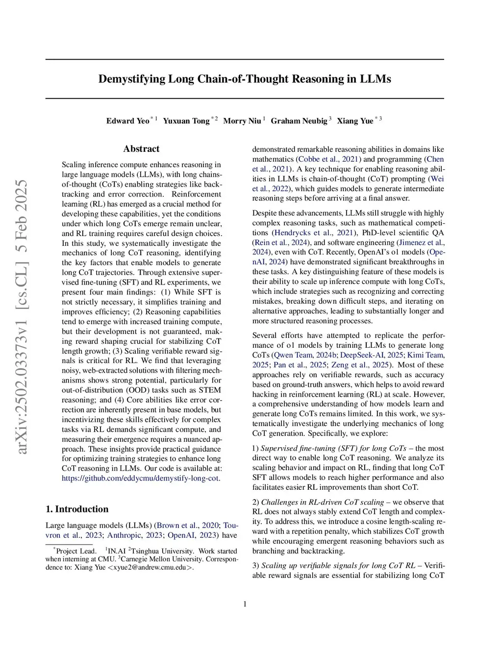 Scaling inference compute enhances reasoning in large language models (LLMs), with long chains-of-thought (CoTs) enabling strategies like backtracking and error correction. Reinforcement learning (RL) has emerged as a crucial method for developing these capabilities, yet the conditions under which long CoTs emerge remain unclear, and RL training requires careful design choices. In this study, we systematically investigate the mechanics of long CoT reasoning, identifying the key factors that enable models to generate long CoT trajectories. Through extensive supervised fine-tuning (SFT) and RL experiments, we present four main findings: (1) While SFT is not strictly necessary, it simplifies training and improves efficiency; (2) Reasoning capabilities tend to emerge with increased training compute, but their development is not guaranteed, making reward shaping crucial for stabilizing CoT length growth; (3) Scaling verifiable reward signals is critical for RL. We find that leveraging noisy, web-extracted solutions with filtering mechanisms shows strong potential, particularly for out-of-distribution (OOD) tasks such as STEM reasoning; and (4) Core abilities like error correction are inherently present in base models, but incentivizing these skills effectively for complex tasks via RL demands significant compute, and measuring their emergence requires a nuanced approach. These insights provide practical guidance for optimizing training strategies to enhance long CoT reasoning in LLMs. Our code is available at:this https URL.