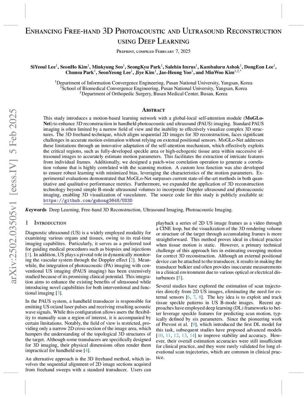 This study introduces a motion-based learning network with a global-local self-attention module (MoGLo-Net) to enhance 3D reconstruction in handheld photoacoustic and ultrasound (PAUS) imaging. Standard PAUS imaging is often limited by a narrow field of view and the inability to effectively visualize complex 3D structures. The 3D freehand technique, which aligns sequential 2D images for 3D reconstruction, faces significant challenges in accurate motion estimation without relying on external positional sensors. MoGLo-Net addresses these limitations through an innovative adaptation of the self-attention mechanism, which effectively exploits the critical regions, such as fully-developed speckle area or high-echogenic tissue area within successive ultrasound images to accurately estimate motion parameters. This facilitates the extraction of intricate features from individual frames. Additionally, we designed a patch-wise correlation operation to generate a correlation volume that is highly correlated with the scanning motion. A custom loss function was also developed to ensure robust learning with minimized bias, leveraging the characteristics of the motion parameters. Experimental evaluations demonstrated that MoGLo-Net surpasses current state-of-the-art methods in both quantitative and qualitative performance metrics. Furthermore, we expanded the application of 3D reconstruction technology beyond simple B-mode ultrasound volumes to incorporate Doppler ultrasound and photoacoustic imaging, enabling 3D visualization of vasculature. The source code for this study is publicly available at:this https URL