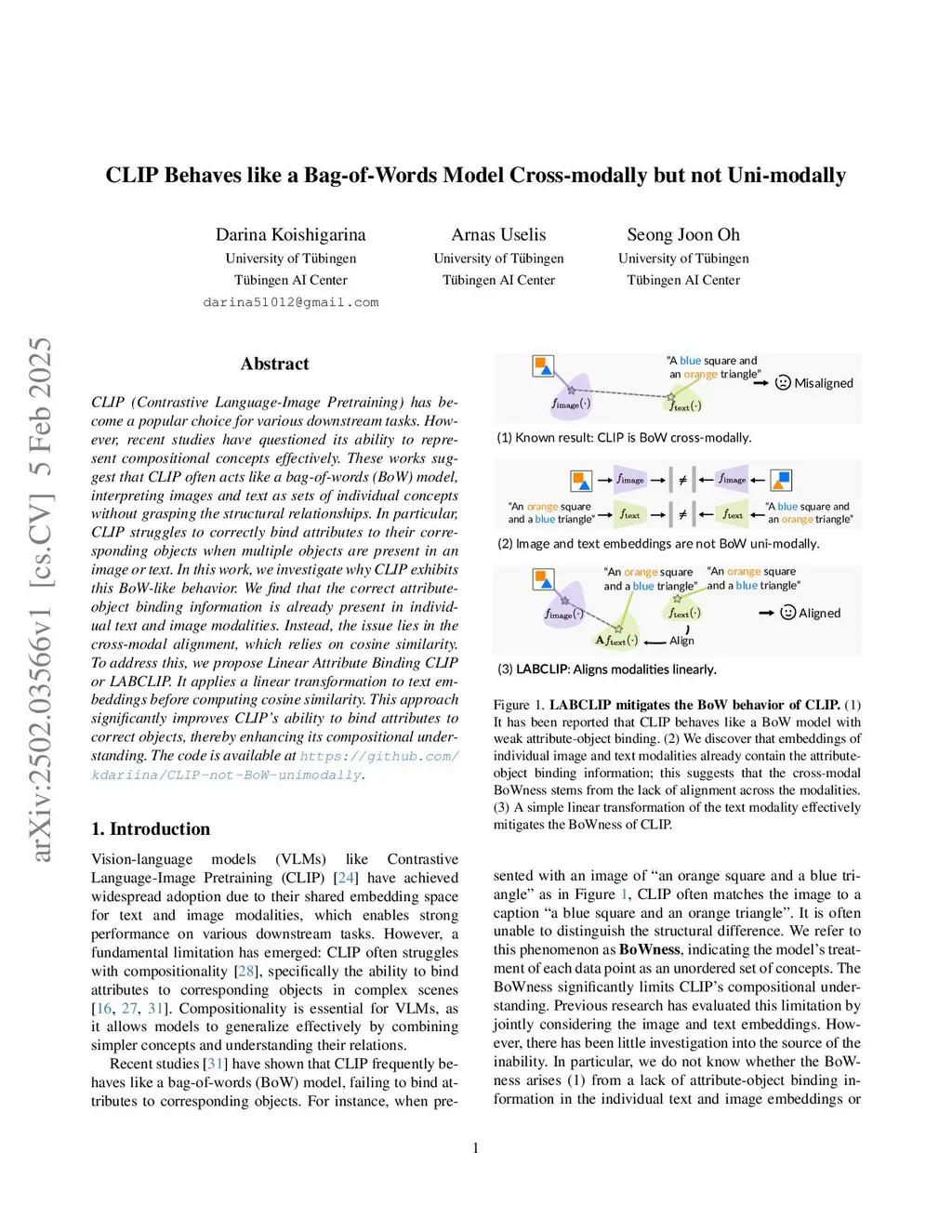 CLIP (Contrastive Language-Image Pretraining) has become a popular choice for various downstream tasks. However, recent studies have questioned its ability to represent compositional concepts effectively. These works suggest that CLIP often acts like a bag-of-words (BoW) model, interpreting images and text as sets of individual concepts without grasping the structural relationships. In particular, CLIP struggles to correctly bind attributes to their corresponding objects when multiple objects are present in an image or text. In this work, we investigate why CLIP exhibits this BoW-like behavior. We find that the correct attribute-object binding information is already present in individual text and image modalities. Instead, the issue lies in the cross-modal alignment, which relies on cosine similarity. To address this, we propose Linear Attribute Binding CLIP or LABCLIP. It applies a linear transformation to text embeddings before computing cosine similarity. This approach significantly improves CLIP's ability to bind attributes to correct objects, thereby enhancing its compositional understanding. The code is available atthis https URL.