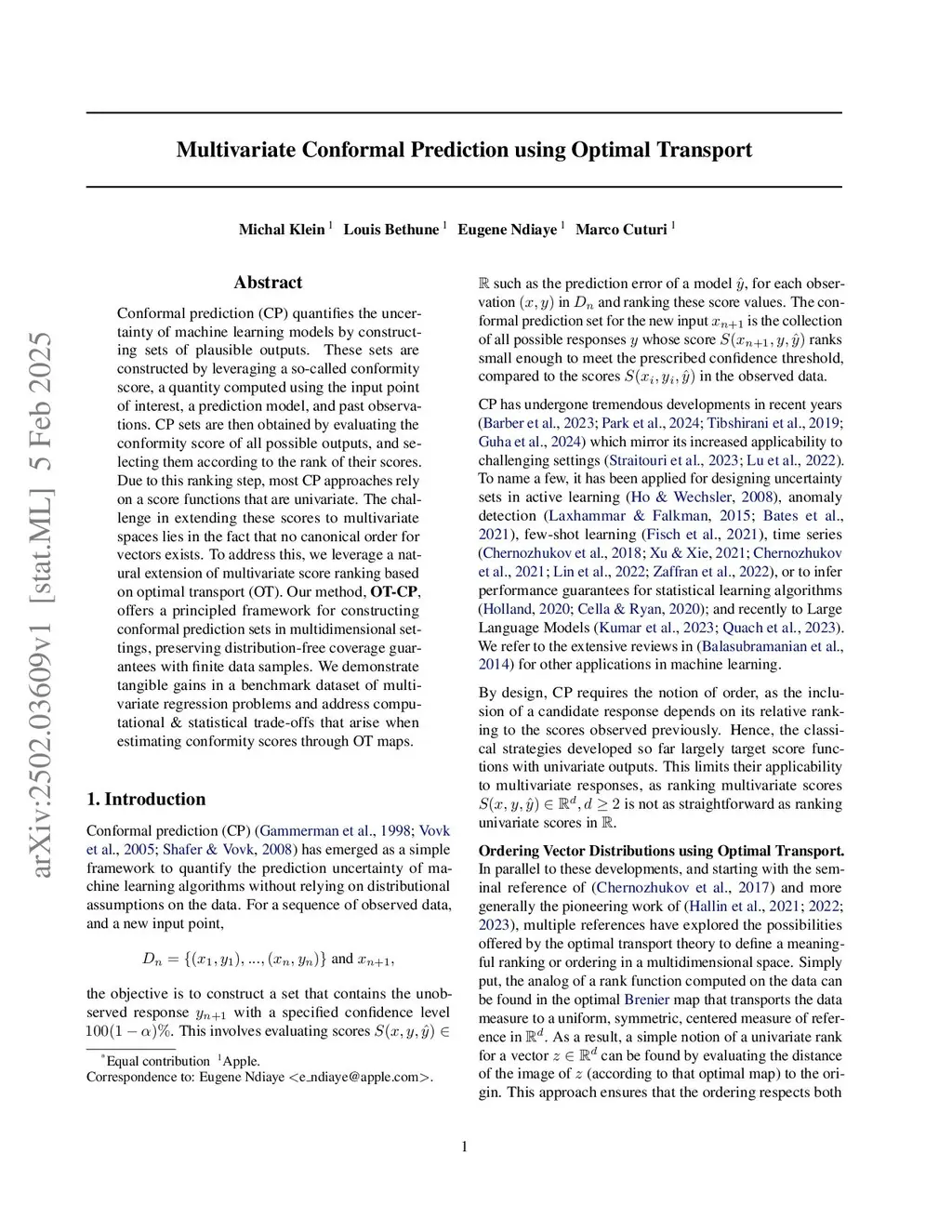 Conformal prediction (CP) quantifies the uncertainty of machine learning models by constructing sets of plausible outputs. These sets are constructed by leveraging a so-called conformity score, a quantity computed using the input point of interest, a prediction model, and past observations. CP sets are then obtained by evaluating the conformity score of all possible outputs, and selecting them according to the rank of their scores. Due to this ranking step, most CP approaches rely on a score functions that are univariate. The challenge in extending these scores to multivariate spaces lies in the fact that no canonical order for vectors exists. To address this, we leverage a natural extension of multivariate score ranking based on optimal transport (OT). Our method, OTCP, offers a principled framework for constructing conformal prediction sets in multidimensional settings, preserving distribution-free coverage guarantees with finite data samples. We demonstrate tangible gains in a benchmark dataset of multivariate regression problems and address computational \& statistical trade-offs that arise when estimating conformity scores through OT maps.