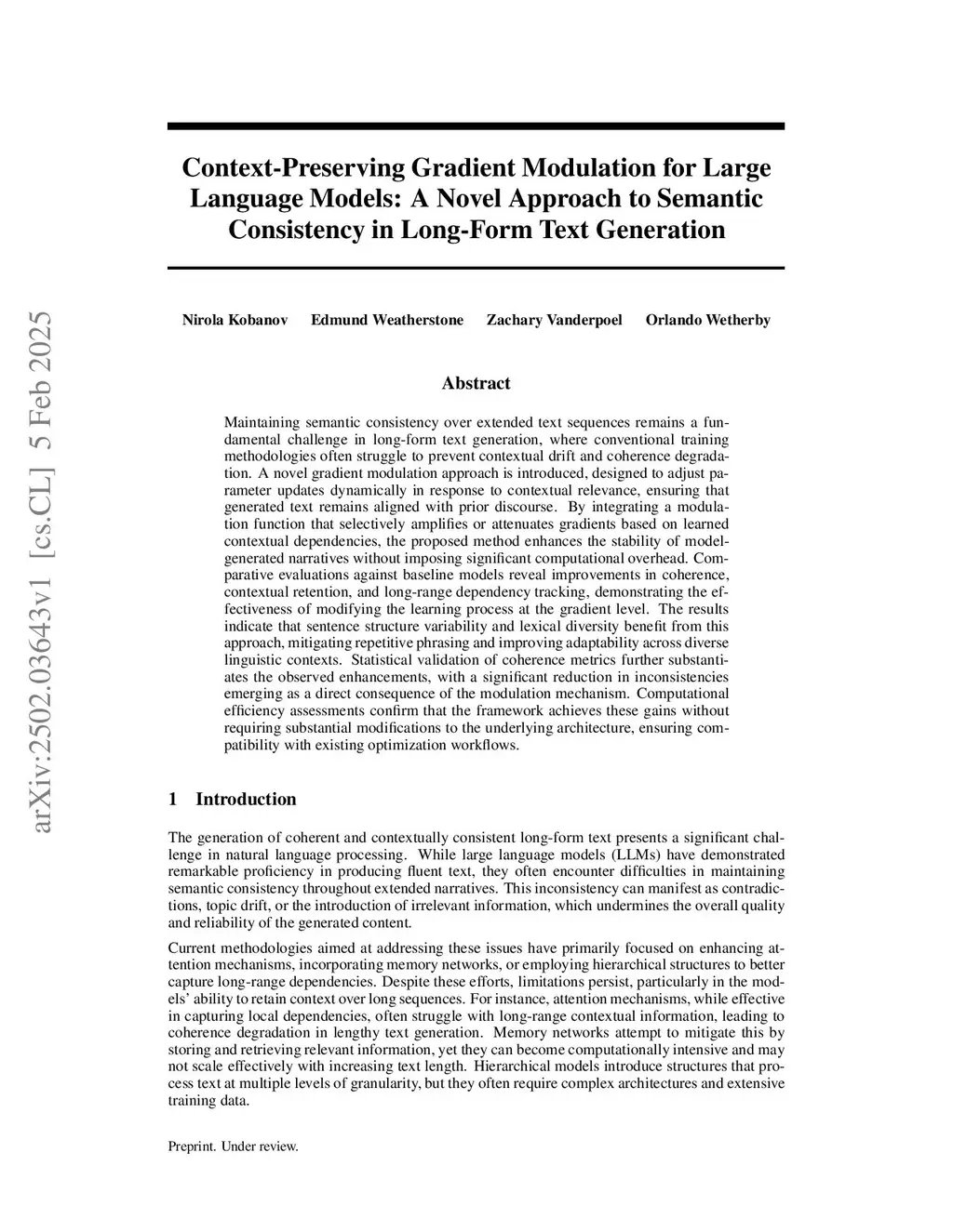 Maintaining semantic consistency over extended text sequences remains a fundamental challenge in long-form text generation, where conventional training methodologies often struggle to prevent contextual drift and coherence degradation. A novel gradient modulation approach is introduced, designed to adjust parameter updates dynamically in response to contextual relevance, ensuring that generated text remains aligned with prior discourse. By integrating a modulation function that selectively amplifies or attenuates gradients based on learned contextual dependencies, the proposed method enhances the stability of model-generated narratives without imposing significant computational overhead. Comparative evaluations against baseline models reveal improvements in coherence, contextual retention, and long-range dependency tracking, demonstrating the effectiveness of modifying the learning process at the gradient level. The results indicate that sentence structure variability and lexical diversity benefit from this approach, mitigating repetitive phrasing and improving adaptability across diverse linguistic contexts. Statistical validation of coherence metrics further substantiates the observed enhancements, with a significant reduction in inconsistencies emerging as a direct consequence of the modulation mechanism. Computational efficiency assessments confirm that the framework achieves these gains without requiring substantial modifications to the underlying architecture, ensuring compatibility with existing optimization workflows.