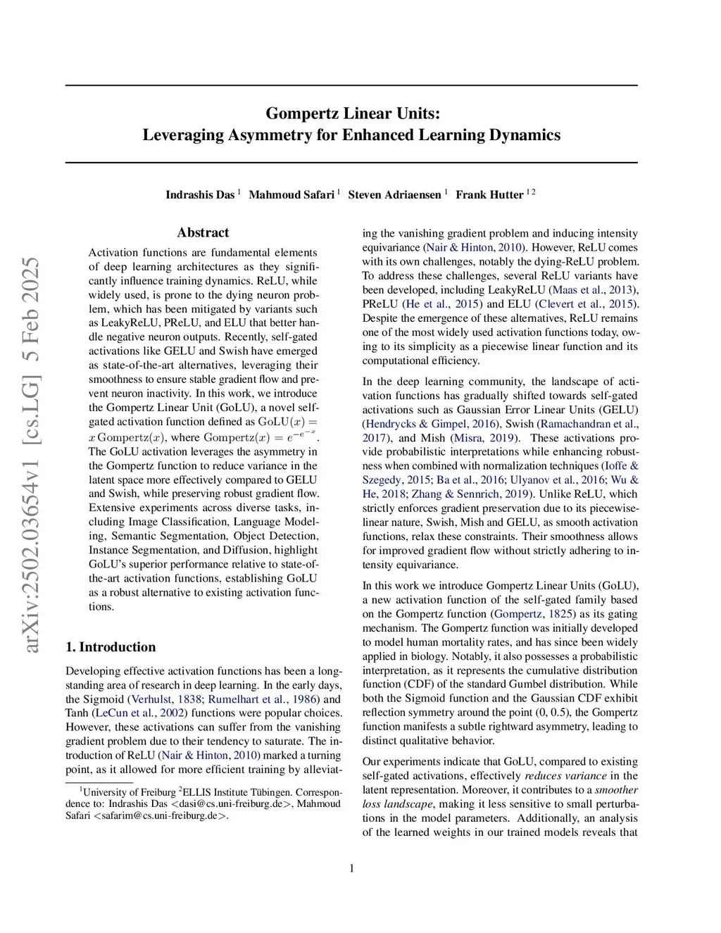 Activation functions are fundamental elements of deep learning architectures as they significantly influence training dynamics. ReLU, while widely used, is prone to the dying neuron problem, which has been mitigated by variants such as LeakyReLU, PReLU, and ELU that better handle negative neuron outputs. Recently, self-gated activations like GELU and Swish have emerged as state-of-the-art alternatives, leveraging their smoothness to ensure stable gradient flow and prevent neuron inactivity. In this work, we introduce the Gompertz Linear Unit (GoLU), a novel self-gated activation function defined as , where . The GoLU activation leverages the right-skewed asymmetry in the Gompertz function to reduce variance in the latent space more effectively compared to GELU and Swish, while preserving robust gradient flow. Extensive experiments across diverse tasks, including Image Classification, Language Modeling, Semantic Segmentation, Object Detection, Instance Segmentation, and Diffusion, highlight GoLU's superior performance relative to state-of-the-art activation functions, establishing GoLU as a robust alternative to existing activation functions.