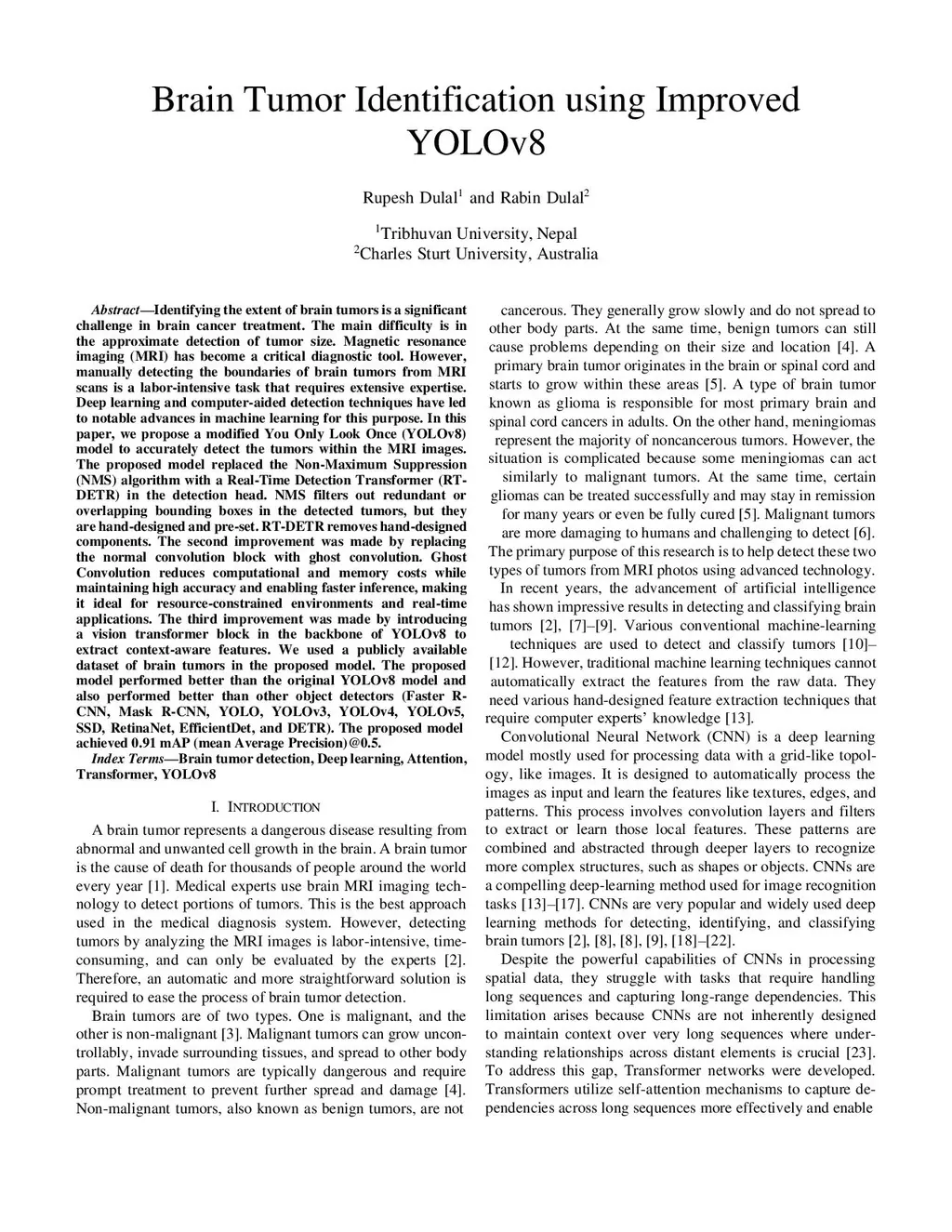 Identifying the extent of brain tumors is a significant challenge in brain cancer treatment. The main difficulty is in the approximate detection of tumor size. Magnetic resonance imaging (MRI) has become a critical diagnostic tool. However, manually detecting the boundaries of brain tumors from MRI scans is a labor-intensive task that requires extensive expertise. Deep learning and computer-aided detection techniques have led to notable advances in machine learning for this purpose. In this paper, we propose a modified You Only Look Once (YOLOv8) model to accurately detect the tumors within the MRI images. The proposed model replaced the Non-Maximum Suppression (NMS) algorithm with a Real-Time Detection Transformer (RT- DETR) in the detection head. NMS filters out redundant or overlapping bounding boxes in the detected tumors, but they are hand-designed and pre-set. RT-DETR removes hand-designed components. The second improvement was made by replacing the normal convolution block with ghost convolution. Ghost Convolution reduces computational and memory costs while maintaining high accuracy and enabling faster inference, making it ideal for resource-constrained environments and real-time applications. The third improvement was made by introducing a vision transformer block in the backbone of YOLOv8 to extract context-aware features. We used a publicly available dataset of brain tumors in the proposed model. The proposed model performed better than the original YOLOv8 model and also performed better than other object detectors (Faster R- CNN, Mask R-CNN, YOLO, YOLOv3, YOLOv4, YOLOv5, SSD, RetinaNet, EfficientDet, and DETR). The proposed model achieved 0.91 mAP (mean Average Precision)@0.5.