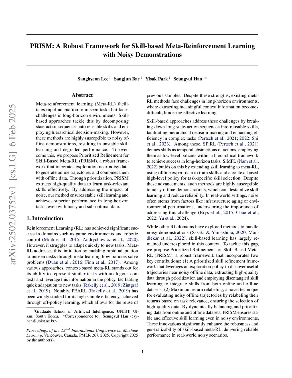 Meta-reinforcement learning (Meta-RL) facilitates rapid adaptation to unseen tasks but faces challenges in long-horizon environments. Skill-based approaches tackle this by decomposing state-action sequences into reusable skills and employing hierarchical decision-making. However, these methods are highly susceptible to noisy offline demonstrations, leading to unstable skill learning and degraded performance. To address this, we propose Self-Improving Skill Learning (SISL), which performs self-guided skill refinement using decoupled high-level and skill improvement policies, while applying skill prioritization via maximum return relabeling to focus updates on task-relevant trajectories, resulting in robust and stable adaptation even under noisy and suboptimal data. By mitigating the effect of noise, SISL achieves reliable skill learning and consistently outperforms other skill-based meta-RL methods on diverse long-horizon tasks. Our code is available atthis https URL.