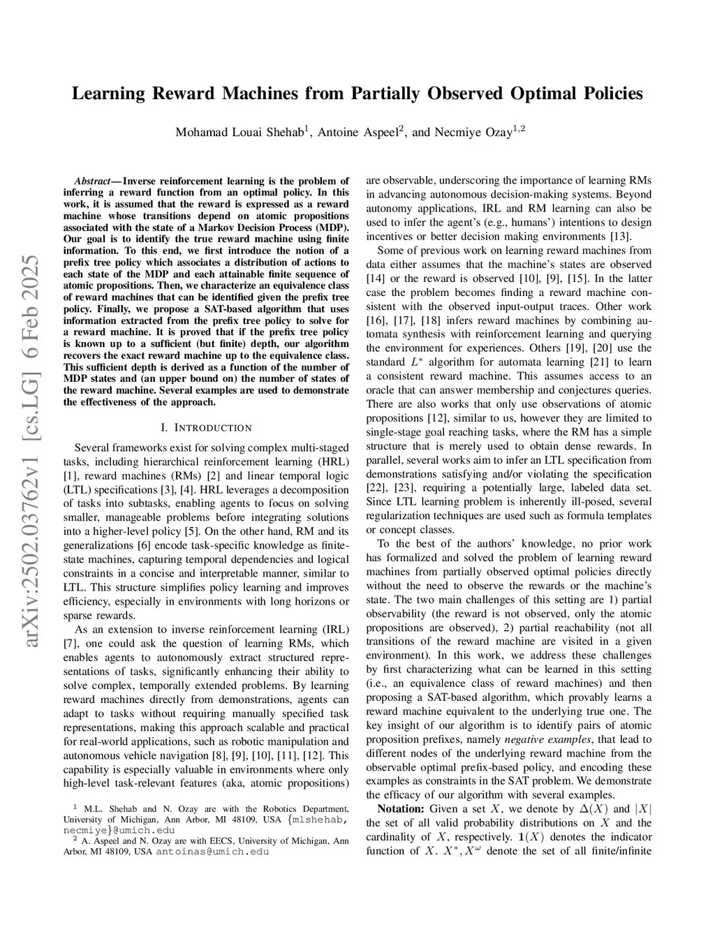Inverse reinforcement learning is the problem of inferring a reward function from an optimal policy or demonstrations by an expert. In this work, it is assumed that the reward is expressed as a reward machine whose transitions depend on atomic propositions associated with the state of a Markov Decision Process (MDP). Our goal is to identify the true reward machine using finite information. To this end, we first introduce the notion of a prefix tree policy which associates a distribution of actions to each state of the MDP and each attainable finite sequence of atomic propositions. Then, we characterize an equivalence class of reward machines that can be identified given the prefix tree policy. Finally, we propose a SAT-based algorithm that uses information extracted from the prefix tree policy to solve for a reward machine. It is proved that if the prefix tree policy is known up to a sufficient (but finite) depth, our algorithm recovers the exact reward machine up to the equivalence class. This sufficient depth is derived as a function of the number of MDP states and (an upper bound on) the number of states of the reward machine. These results are further extended to the case where we only have access to demonstrations from an optimal policy. Several examples, including discrete grid and block worlds, a continuous state-space robotic arm, and real data from experiments with mice, are used to demonstrate the effectiveness and generality of the approach.