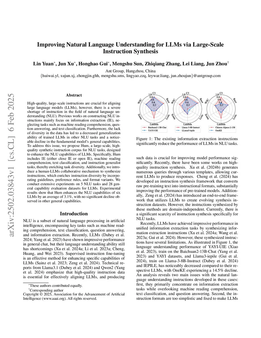 High-quality, large-scale instructions are crucial for aligning large language models (LLMs), however, there is a severe shortage of instruction in the field of natural language understanding (NLU). Previous works on constructing NLU instructions mainly focus on information extraction (IE), neglecting tasks such as machine reading comprehension, question answering, and text classification. Furthermore, the lack of diversity in the data has led to a decreased generalization ability of trained LLMs in other NLU tasks and a noticeable decline in the fundamental model's general capabilities. To address this issue, we propose Hum, a large-scale, high-quality synthetic instruction corpus for NLU tasks, designed to enhance the NLU capabilities of LLMs. Specifically, Hum includes IE (either close IE or open IE), machine reading comprehension, text classification, and instruction generalist tasks, thereby enriching task diversity. Additionally, we introduce a human-LLMs collaborative mechanism to synthesize instructions, which enriches instruction diversity by incorporating guidelines, preference rules, and format variants. We conduct extensive experiments on 5 NLU tasks and 28 general capability evaluation datasets for LLMs. Experimental results show that Hum enhances the NLU capabilities of six LLMs by an average of 3.1\%, with no significant decline observed in other general capabilities.