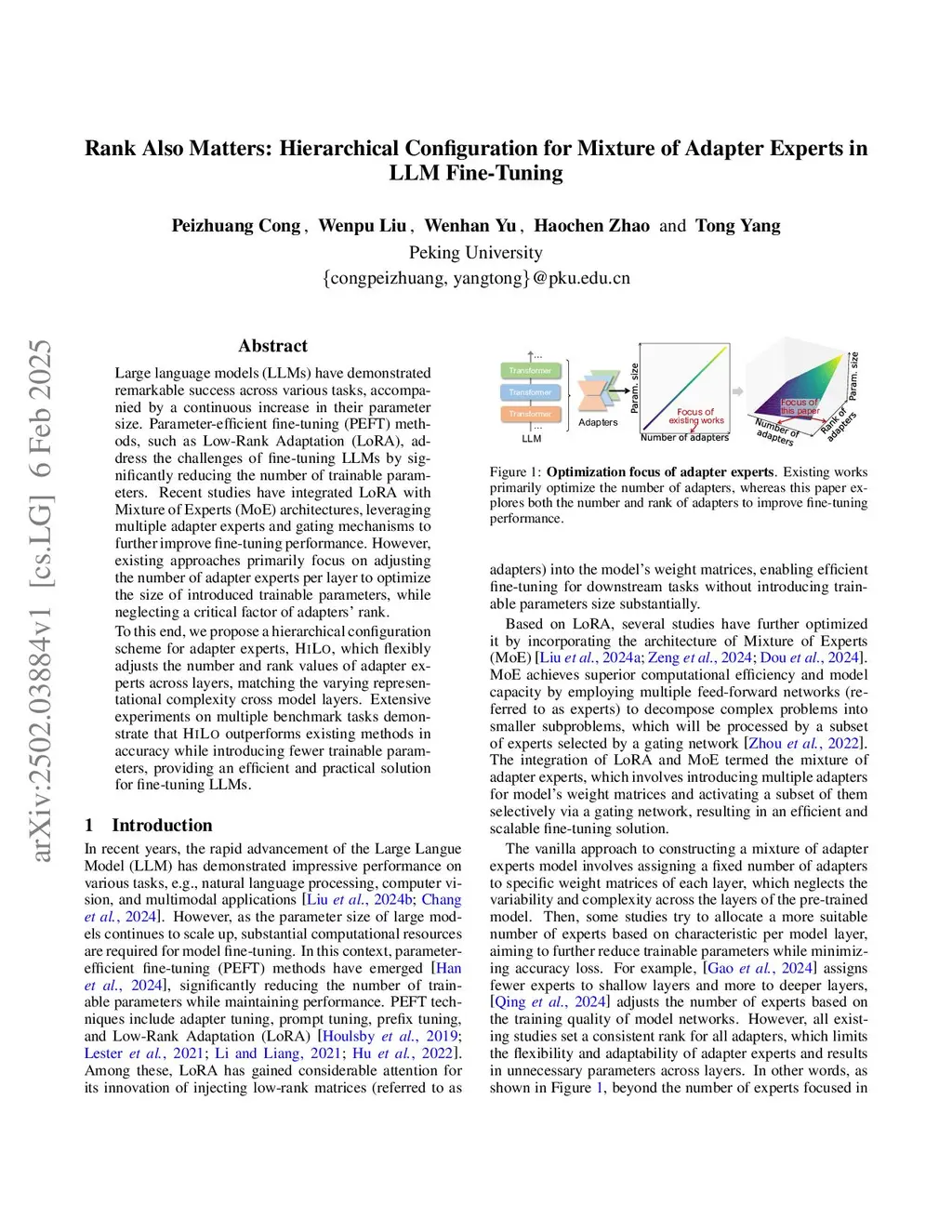Large language models (LLMs) have demonstrated remarkable success across various tasks, accompanied by a continuous increase in their parameter size. Parameter-efficient fine-tuning (PEFT) methods, such as Low-Rank Adaptation (LoRA), address the challenges of fine-tuning LLMs by significantly reducing the number of trainable parameters. Recent studies have integrated LoRA with Mixture of Experts (MoE) architectures, leveraging multiple adapter experts and gating mechanisms to further improve fine-tuning performance. However, existing approaches primarily focus on adjusting the allocations of adapter experts per layer to optimize the introduced trainable parameter size, while neglecting a critical factor of adapters' rank. To this end, we propose a hierarchical scheme for expert allocation and rank configuration, HILO, which dynamically adjusts the number and rank of adapter experts across layers, matching the varying representational complexity of model layers in adapter-granularity. Extensive experiments on multiple benchmark tasks demonstrate that HILO outperforms existing methods in accuracy while introducing fewer trainable parameters, providing an efficient and practical solution for fine-tuning LLMs.