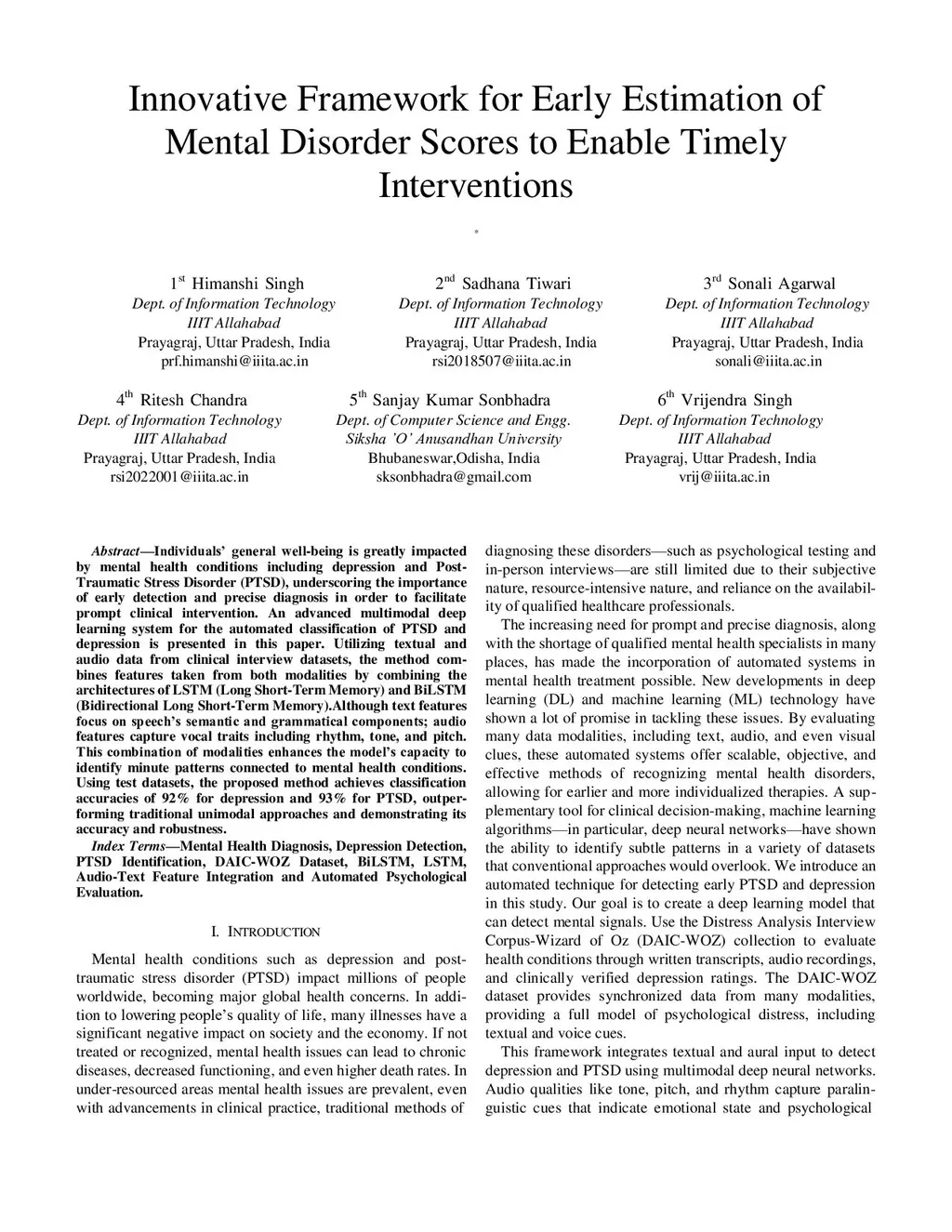 Individual's general well-being is greatly impacted by mental health conditions including depression and Post-Traumatic Stress Disorder (PTSD), underscoring the importance of early detection and precise diagnosis in order to facilitate prompt clinical intervention. An advanced multimodal deep learning system for the automated classification of PTSD and depression is presented in this paper. Utilizing textual and audio data from clinical interview datasets, the method combines features taken from both modalities by combining the architectures of LSTM (Long Short Term Memory) and BiLSTM (Bidirectional Long Short-Term Memory).Although text features focus on speech's semantic and grammatical components; audio features capture vocal traits including rhythm, tone, and pitch. This combination of modalities enhances the model's capacity to identify minute patterns connected to mental health conditions. Using test datasets, the proposed method achieves classification accuracies of 92% for depression and 93% for PTSD, outperforming traditional unimodal approaches and demonstrating its accuracy and robustness.