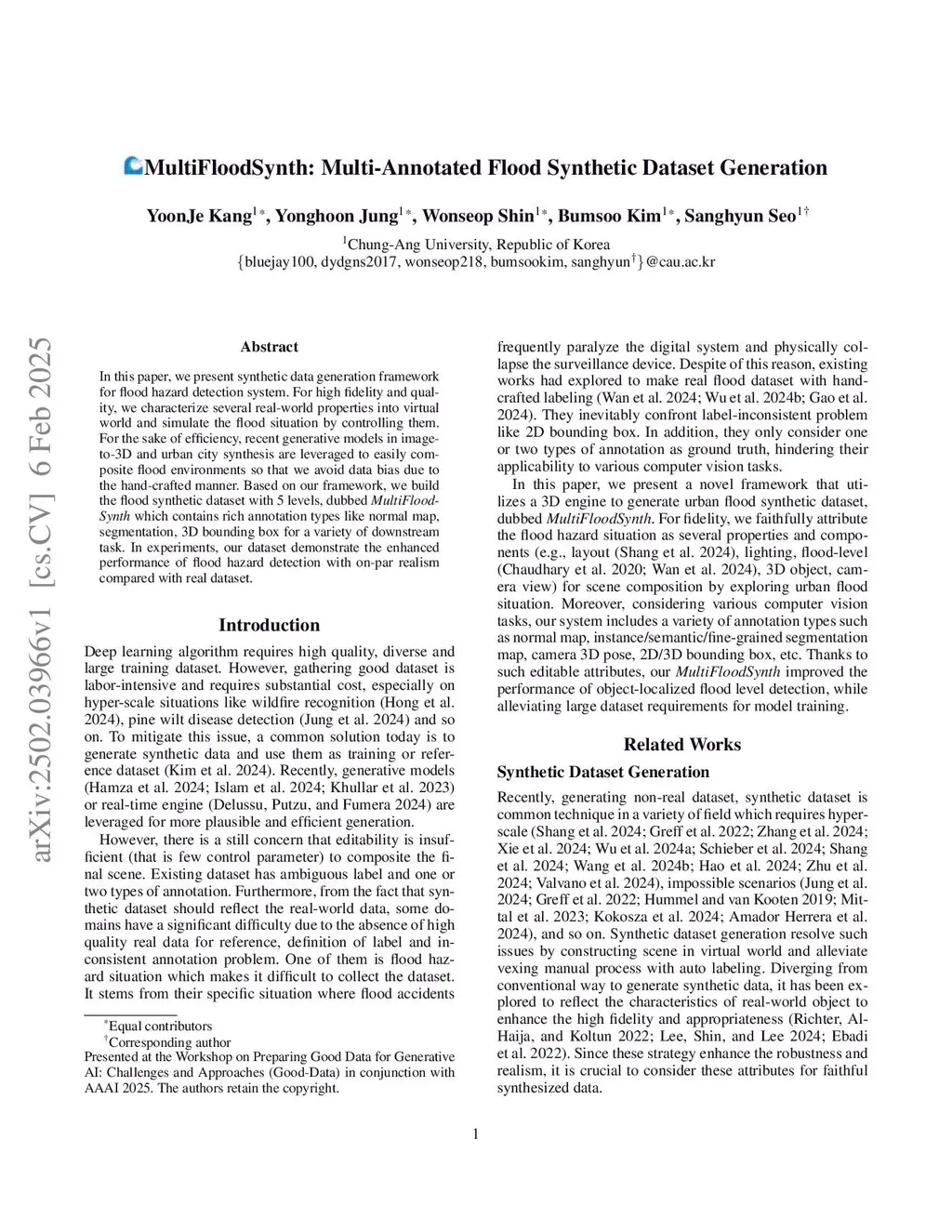 In this paper, we present synthetic data generation framework for flood hazard detection system. For high fidelity and quality, we characterize several real-world properties into virtual world and simulate the flood situation by controlling them. For the sake of efficiency, recent generative models in image-to-3D and urban city synthesis are leveraged to easily composite flood environments so that we avoid data bias due to the hand-crafted manner. Based on our framework, we build the flood synthetic dataset with 5 levels, dubbed MultiFloodSynth which contains rich annotation types like normal map, segmentation, 3D bounding box for a variety of downstream task. In experiments, our dataset demonstrate the enhanced performance of flood hazard detection with on-par realism compared with real dataset.