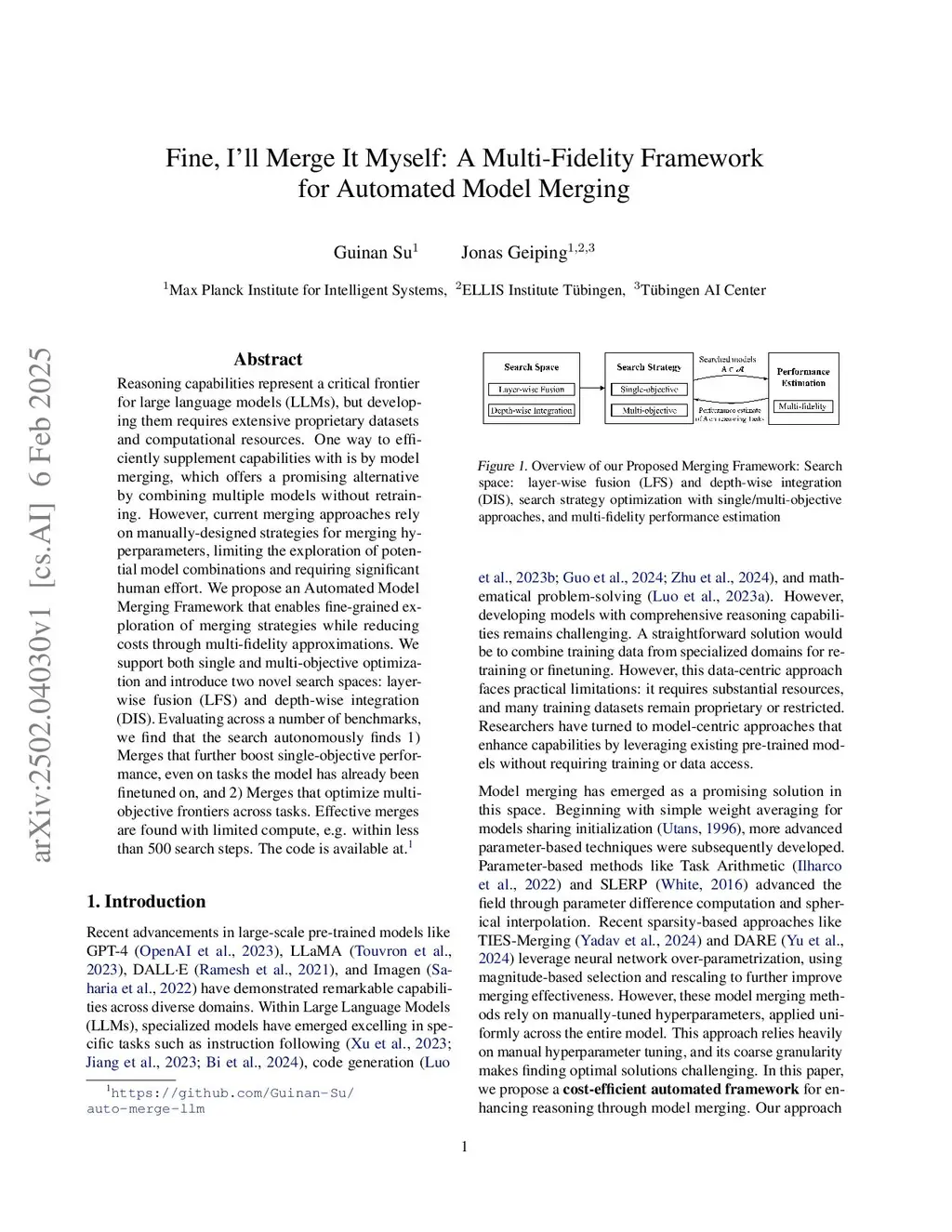 Reasoning capabilities represent a critical frontier for large language models (LLMs), but developing them requires extensive proprietary datasets and computational resources. One way to efficiently supplement capabilities with is by model merging, which offers a promising alternative by combining multiple models without retraining. However, current merging approaches rely on manually-designed strategies for merging hyperparameters, limiting the exploration of potential model combinations and requiring significant human effort. We propose an Automated Model Merging Framework that enables fine-grained exploration of merging strategies while reducing costs through multi-fidelity approximations. We support both single and multi-objective optimization and introduce two novel search spaces: layerwise fusion (LFS) and depth-wise integration (DIS). Evaluating across a number of benchmarks, we find that the search autonomously finds 1) Merges that further boost single-objective performance, even on tasks the model has already been finetuned on, and 2) Merges that optimize multi-objective frontiers across tasks. Effective merges are found with limited compute, e.g. within less than 500 search steps.