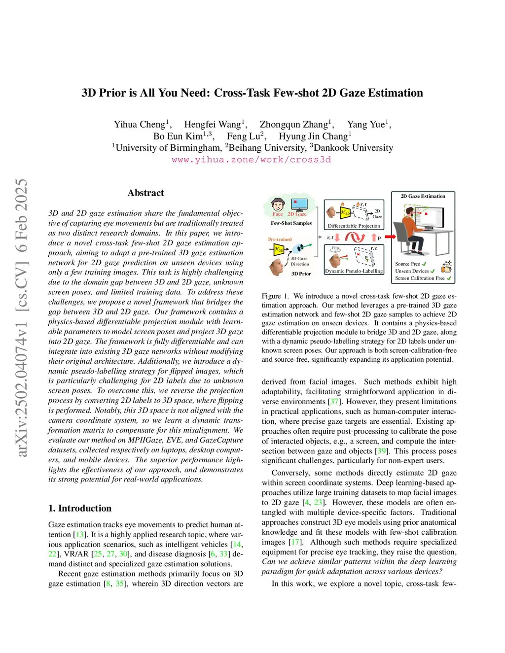 3D and 2D gaze estimation share the fundamental objective of capturing eye movements but are traditionally treated as two distinct research domains. In this paper, we introduce a novel cross-task few-shot 2D gaze estimation approach, aiming to adapt a pre-trained 3D gaze estimation network for 2D gaze prediction on unseen devices using only a few training images. This task is highly challenging due to the domain gap between 3D and 2D gaze, unknown screen poses, and limited training data. To address these challenges, we propose a novel framework that bridges the gap between 3D and 2D gaze. Our framework contains a physics-based differentiable projection module with learnable parameters to model screen poses and project 3D gaze into 2D gaze. The framework is fully differentiable and can integrate into existing 3D gaze networks without modifying their original architecture. Additionally, we introduce a dynamic pseudo-labelling strategy for flipped images, which is particularly challenging for 2D labels due to unknown screen poses. To overcome this, we reverse the projection process by converting 2D labels to 3D space, where flipping is performed. Notably, this 3D space is not aligned with the camera coordinate system, so we learn a dynamic transformation matrix to compensate for this misalignment. We evaluate our method on MPIIGaze, EVE, and GazeCapture datasets, collected respectively on laptops, desktop computers, and mobile devices. The superior performance highlights the effectiveness of our approach, and demonstrates its strong potential for real-world applications.