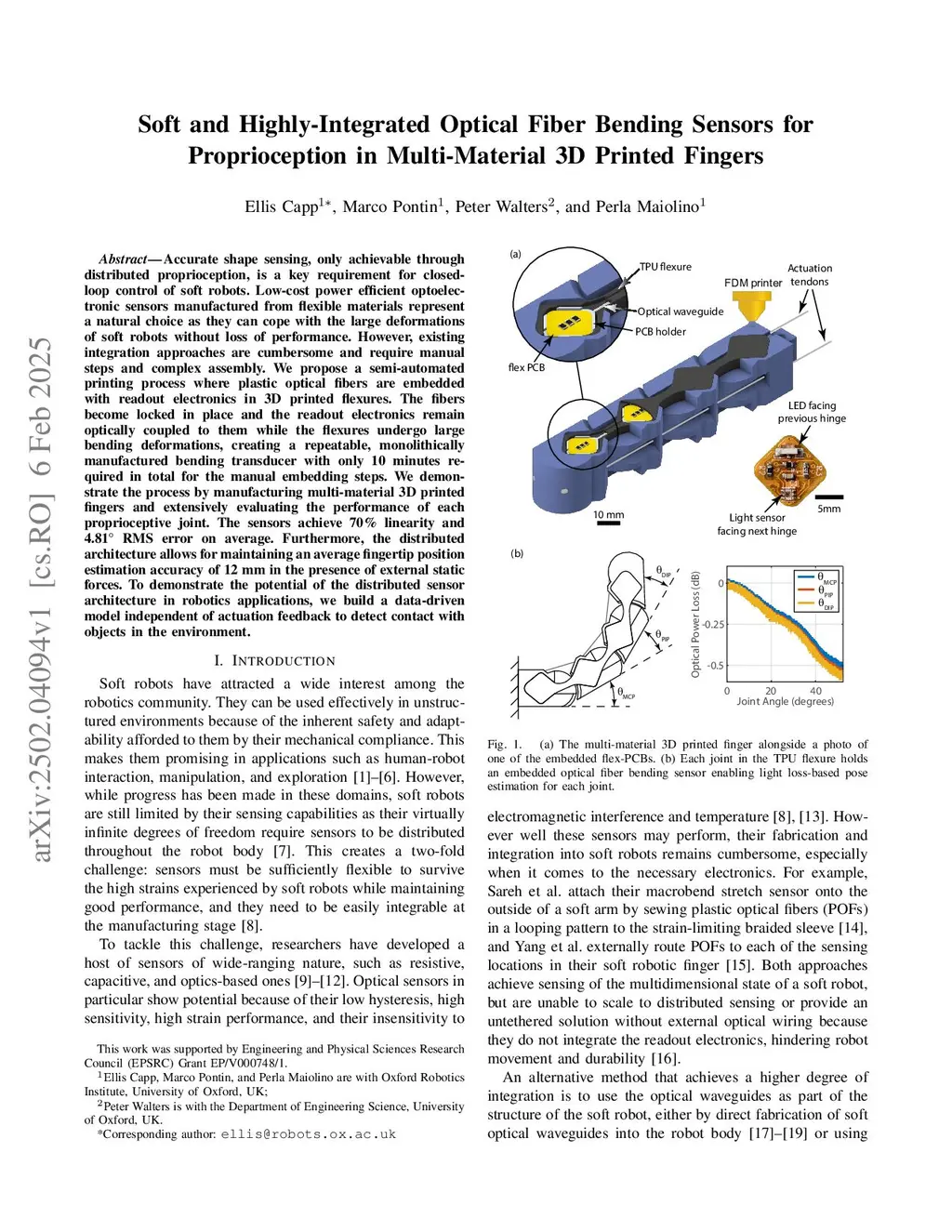 Soft and Highly-Integrated Optical Fiber Bending Sensors for Proprioception in Multi-Material 3D Printed Fingers