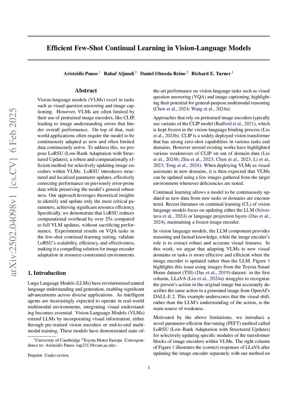 Vision-language models (VLMs) excel in tasks such as visual question answering and image captioning. However, VLMs are often limited by their use of pretrained image encoders, like CLIP, leading to image understanding errors that hinder overall performance. On top of that, real-world applications often require the model to be continuously adapted as new and often limited data continuously arrive. To address this, we propose LoRSU (Low-Rank Adaptation with Structured Updates), a robust and computationally efficient method for selectively updating image encoders within VLMs. LoRSU introduces structured and localized parameter updates, effectively correcting performance on previously error-prone data while preserving the model's general robustness. Our approach leverages theoretical insights to identify and update only the most critical parameters, achieving significant resource efficiency. Specifically, we demonstrate that LoRSU reduces computational overhead by over 25x compared to full VLM updates, without sacrificing performance. Experimental results on VQA tasks in the few-shot continual learning setting, validate LoRSU's scalability, efficiency, and effectiveness, making it a compelling solution for image encoder adaptation in resource-constrained environments.