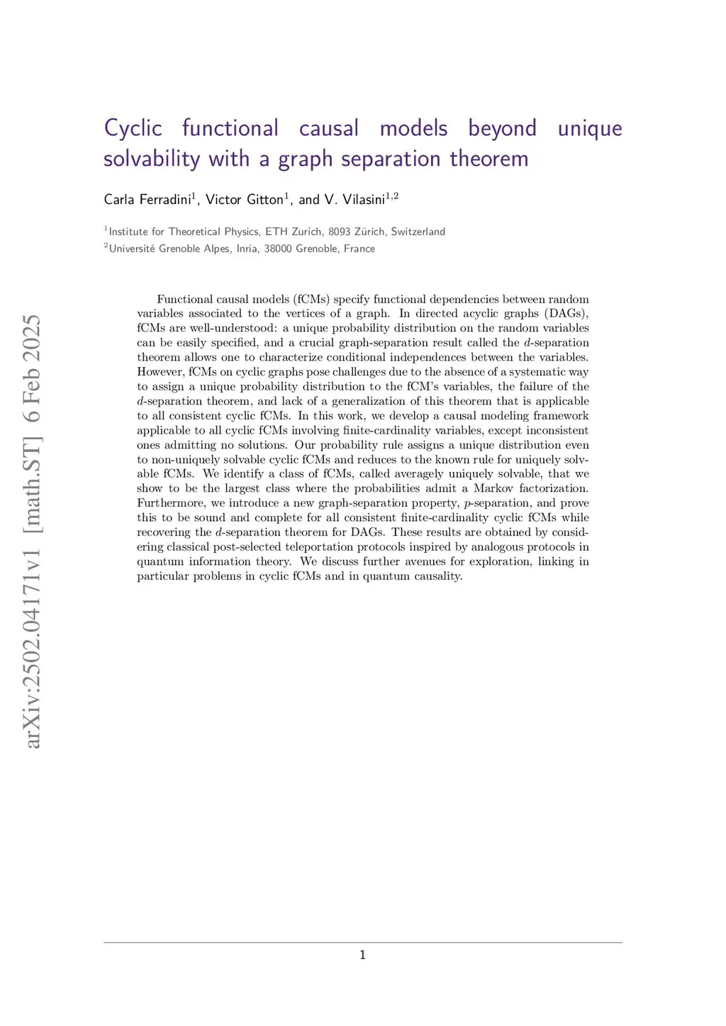 Functional causal models (fCMs) specify functional dependencies between random variables associated to the vertices of a graph. In directed acyclic graphs (DAGs), fCMs are well-understood: a unique probability distribution on the random variables can be easily specified, and a crucial graph-separation result called the d-separation theorem allows one to characterize conditional independences between the variables. However, fCMs on cyclic graphs pose challenges due to the absence of a systematic way to assign a unique probability distribution to the fCM's variables, the failure of the d-separation theorem, and lack of a generalization of this theorem that is applicable to all consistent cyclic fCMs. In this work, we develop a causal modeling framework applicable to all cyclic fCMs involving finite-cardinality variables, except inconsistent ones admitting no solutions. Our probability rule assigns a unique distribution even to non-uniquely solvable cyclic fCMs and reduces to the known rule for uniquely solvable fCMs. We identify a class of fCMs, called averagely uniquely solvable, that we show to be the largest class where the probabilities admit a Markov factorization. Furthermore, we introduce a new graph-separation property, p-separation, and prove this to be sound and complete for all consistent finite-cardinality cyclic fCMs while recovering the d-separation theorem for DAGs. These results are obtained by considering classical post-selected teleportation protocols inspired by analogous protocols in quantum information theory. We discuss further avenues for exploration, linking in particular problems in cyclic fCMs and in quantum causality.