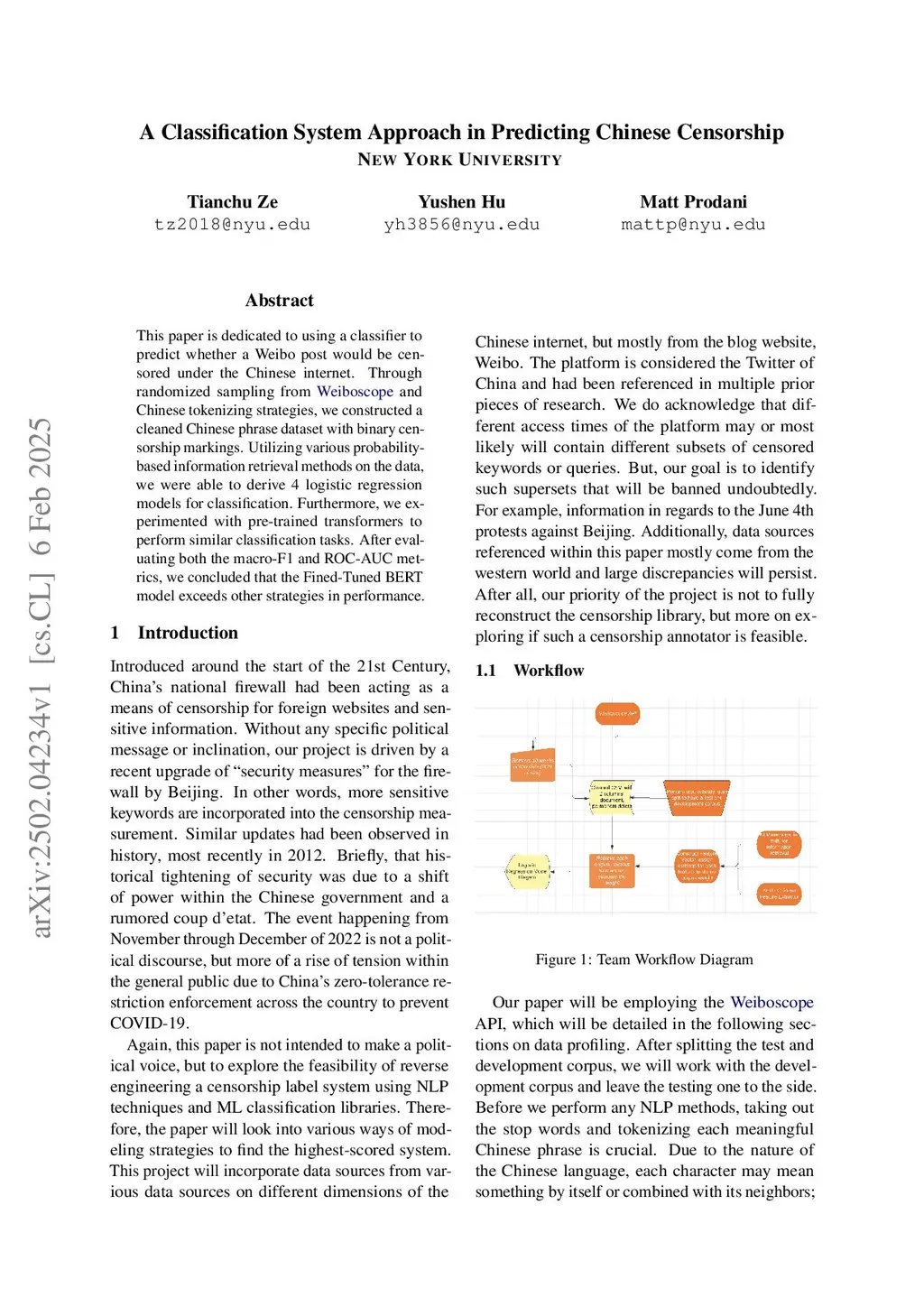 This paper is dedicated to using a classifier to predict whether a Weibo post would be censored under the Chinese internet. Through randomized sampling from \citeauthor{Fu2021} and Chinese tokenizing strategies, we constructed a cleaned Chinese phrase dataset with binary censorship markings. Utilizing various probability-based information retrieval methods on the data, we were able to derive 4 logistic regression models for classification. Furthermore, we experimented with pre-trained transformers to perform similar classification tasks. After evaluating both the macro-F1 and ROC-AUC metrics, we concluded that the Fined-Tuned BERT model exceeds other strategies in performance.