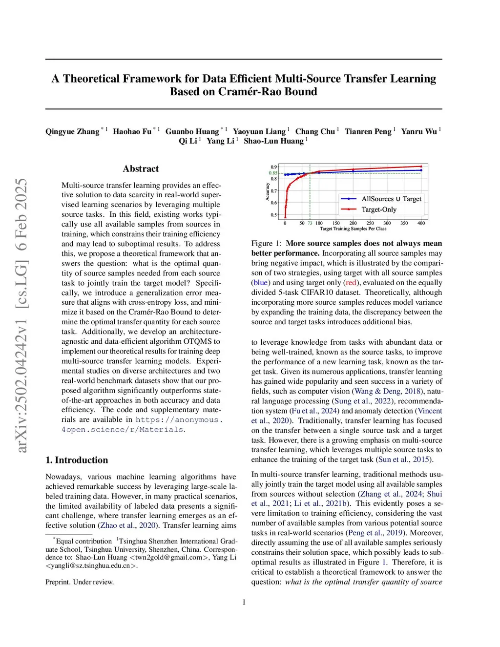Multi-source transfer learning provides an effective solution to data scarcity in real- world supervised learning scenarios by leveraging multiple source tasks. In this field, existing works typically use all available samples from sources in training, which constrains their training efficiency and may lead to suboptimal results. To address this, we propose a theoretical framework that answers the question: what is the optimal quantity of source samples needed from each source task to jointly train the target model? Specifically, we introduce a generalization error measure based on K-L divergence, and minimize it based on high-dimensional statistical analysis to determine the optimal transfer quantity for each source task. Additionally, we develop an architecture-agnostic and data-efficient algorithm OTQMS to implement our theoretical results for target model training in multi- source transfer learning. Experimental studies on diverse architectures and two real-world benchmark datasets show that our proposed algorithm significantly outperforms state-of-the-art approaches in both accuracy and data efficiency. The code and supplementary materials are available inthis https URL.