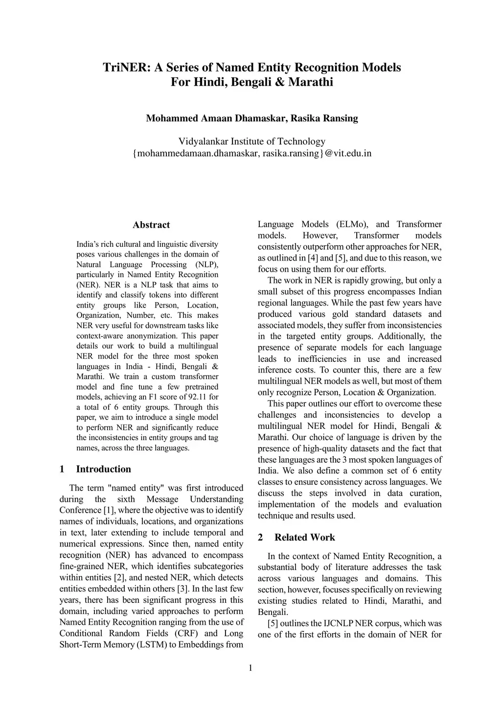 India's rich cultural and linguistic diversity poses various challenges in the domain of Natural Language Processing (NLP), particularly in Named Entity Recognition (NER). NER is a NLP task that aims to identify and classify tokens into different entity groups like Person, Location, Organization, Number, etc. This makes NER very useful for downstream tasks like context-aware anonymization. This paper details our work to build a multilingual NER model for the three most spoken languages in India - Hindi, Bengali & Marathi. We train a custom transformer model and fine tune a few pretrained models, achieving an F1 Score of 92.11 for a total of 6 entity groups. Through this paper, we aim to introduce a single model to perform NER and significantly reduce the inconsistencies in entity groups and tag names, across the three languages.