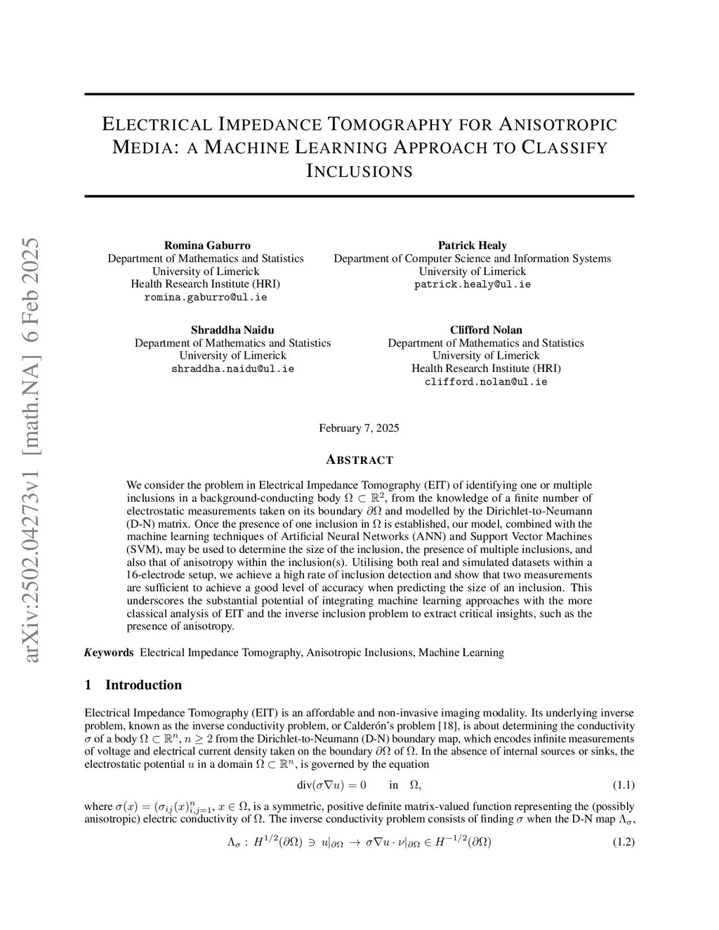 We consider the problem in Electrical Impedance Tomography (EIT) of identifying one or multiple inclusions in a background-conducting body , from the knowledge of a finite number of electrostatic measurements taken on its boundary and modelled by the Dirichlet-to-Neumann (D-N) matrix. Once the presence of one inclusion in is established, our model, combined with the machine learning techniques of Artificial Neural Networks (ANN) and Support Vector Machines (SVM), may be used to determine the size of the inclusion, the presence of multiple inclusions, and also that of anisotropy within the inclusion(s). Utilising both real and simulated datasets within a 16-electrode setup, we achieve a high rate of inclusion detection and show that two measurements are sufficient to achieve a good level of accuracy when predicting the size of an inclusion. This underscores the substantial potential of integrating machine learning approaches with the more classical analysis of EIT and the inverse inclusion problem to extract critical insights, such as the presence of anisotropy.